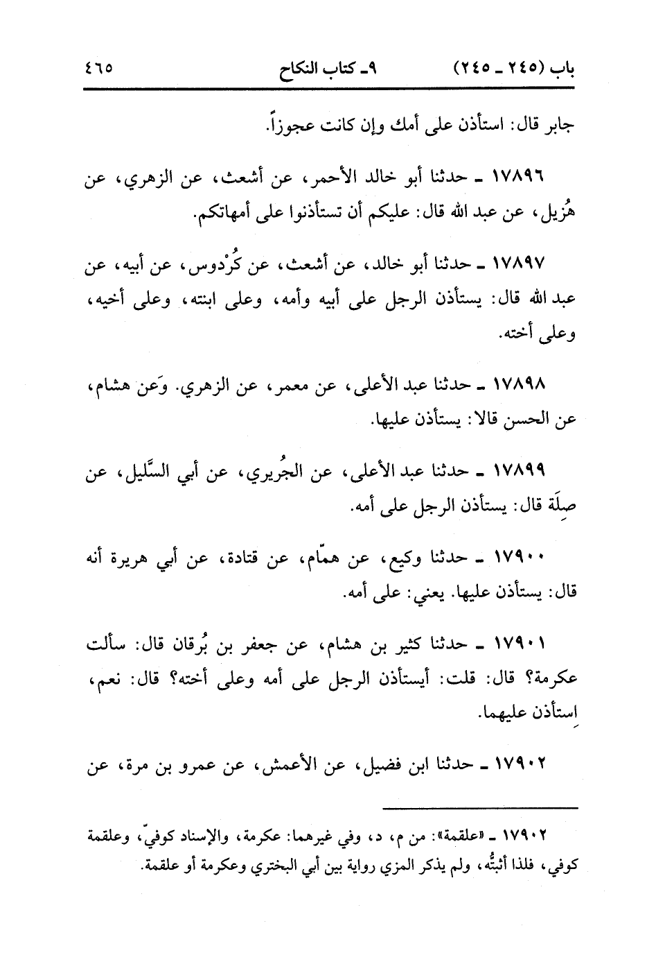 17896- حَدَّثَنَا أَبُو خَالِدٍ الأَحْمَرُ , عَنْ أَشْعَثَ , عَنِ الزُّهْرِيِّ , عَنْ هُزَيْلٍ , عَنْ عَبْدِ اللهِ قَالَ : عَلَيْكُمْ أَنْ تَسْتَأْذِنُوا عَلَى أُمَّهَاتِكُمْ.
