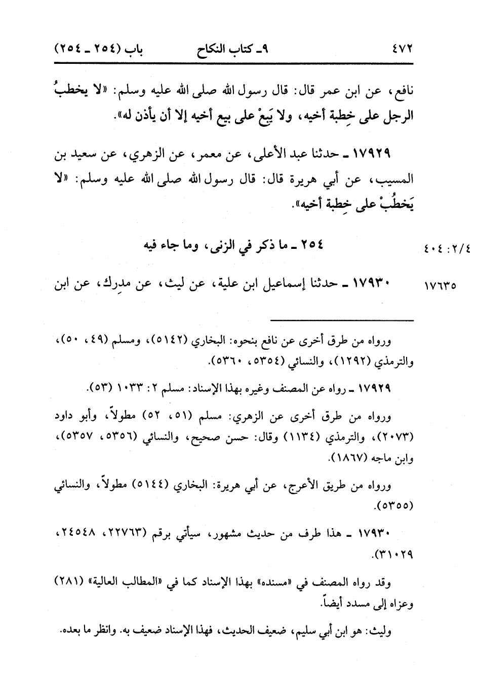 17929- حَدَّثَنَا عَبْدُ الأَعْلَى , عَنْ مَعْمَرٍ , عَنِ الزُّهْرِيِّ , عَنْ سَعِيدِ بْنِ الْمُسَيَّبِ , عَنْ أَبِي هُرَيْرَةَ ، قَالَ : قَالَ رَسُولُ اللهِ صَلَّى الله عَلَيْهِ وَسَلَّمَ : لاَ يَخْطُب عَلَى خِطْبَةِ أَخِيهِ. (4/403:2)
