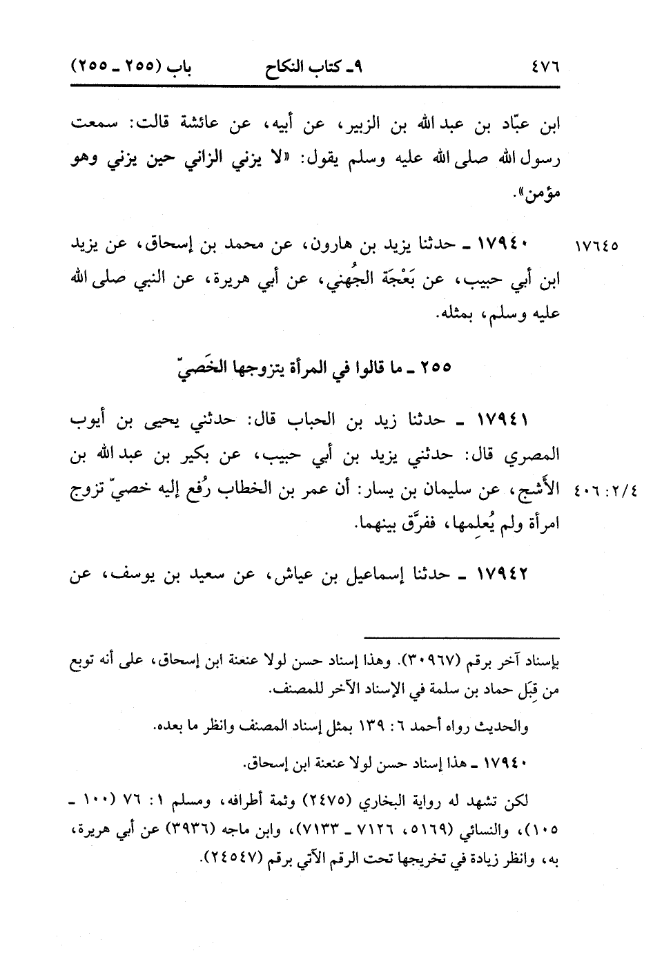 17941- حَدَّثَنَا زَيْدُ بْنُ الْحُبَابِ قَالَ : حدَّثَنِي يَحْيَى بْنُ أَيُّوبَ الْمِصْرِيُّ قَالَ : حَدَّثَنِي يَزِيدُ بْنُ أَبِي حَبِيبٍ , عَنْ بُكَيْرِ بْنِ عَبْدِ اللهِ بْنِ الأَشَجِّ , عَنْ سُلَيْمَانَ بْنِ يَسَارٍ أَنَّ عُمَرَ بْنَ الْخَطَّابِ رُفِعَ إلَيْهِ خَصِيٌّ تَزَوَّجَ امْرَأَةً وَلَمْ يُعْلِمْهَا فَفَرَّقَ بَيْنَهُمَا. (4/405:2)
