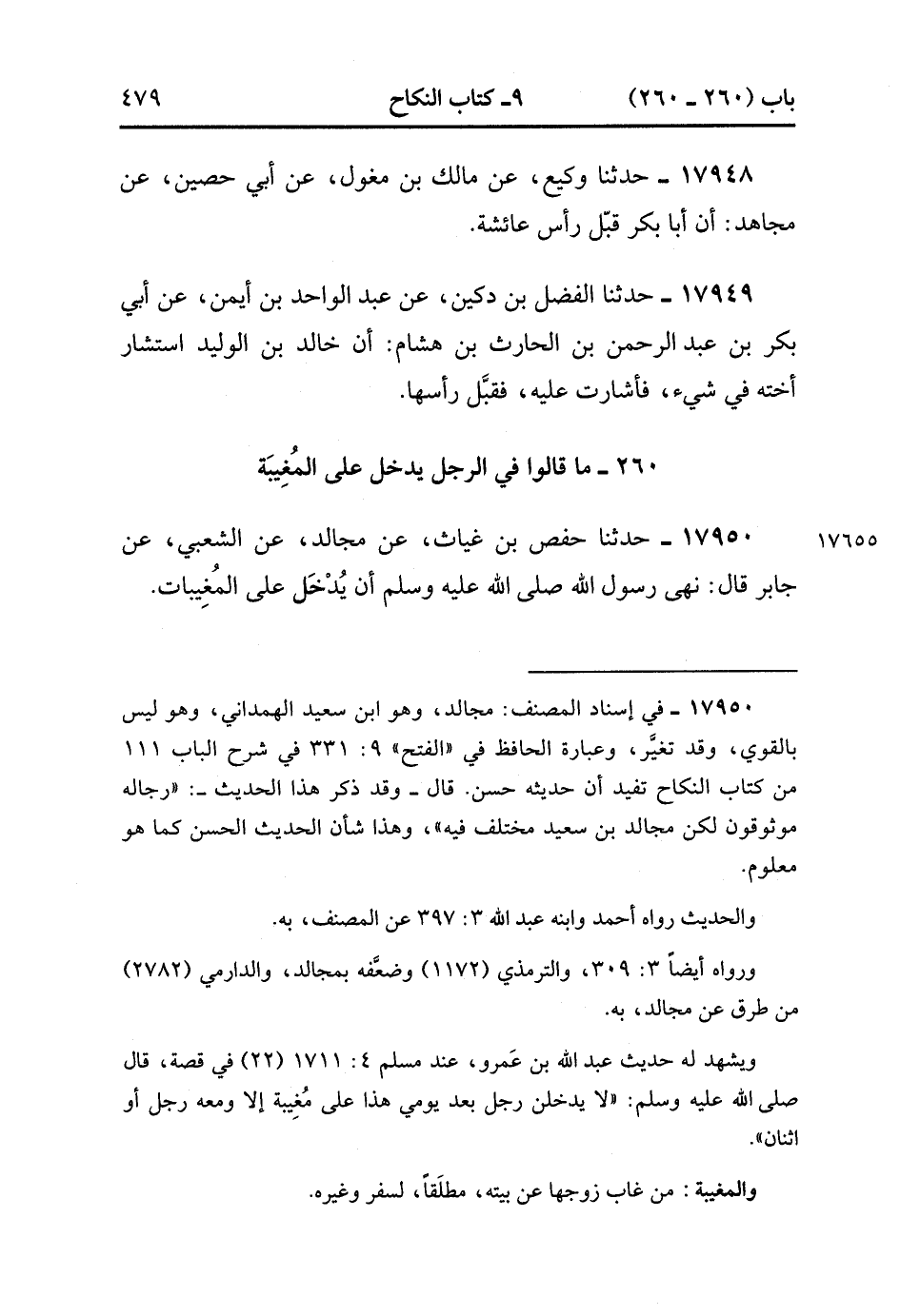 17950- حَدَّثَنَا حَفْصُ بْنُ غِيَاثٍ , عَنْ مُجَالِدٍ , عَنِ الشَّعْبِيِّ , عَنْ جَابِرٍ قَالَ : نَهَى رَسُولُ اللهِ صَلَّى الله عَلَيْهِ وَسَلَّمَ أَنْ يُدْخلَ عَلَى الْمُغِيبَاتِ. (4/408:2).