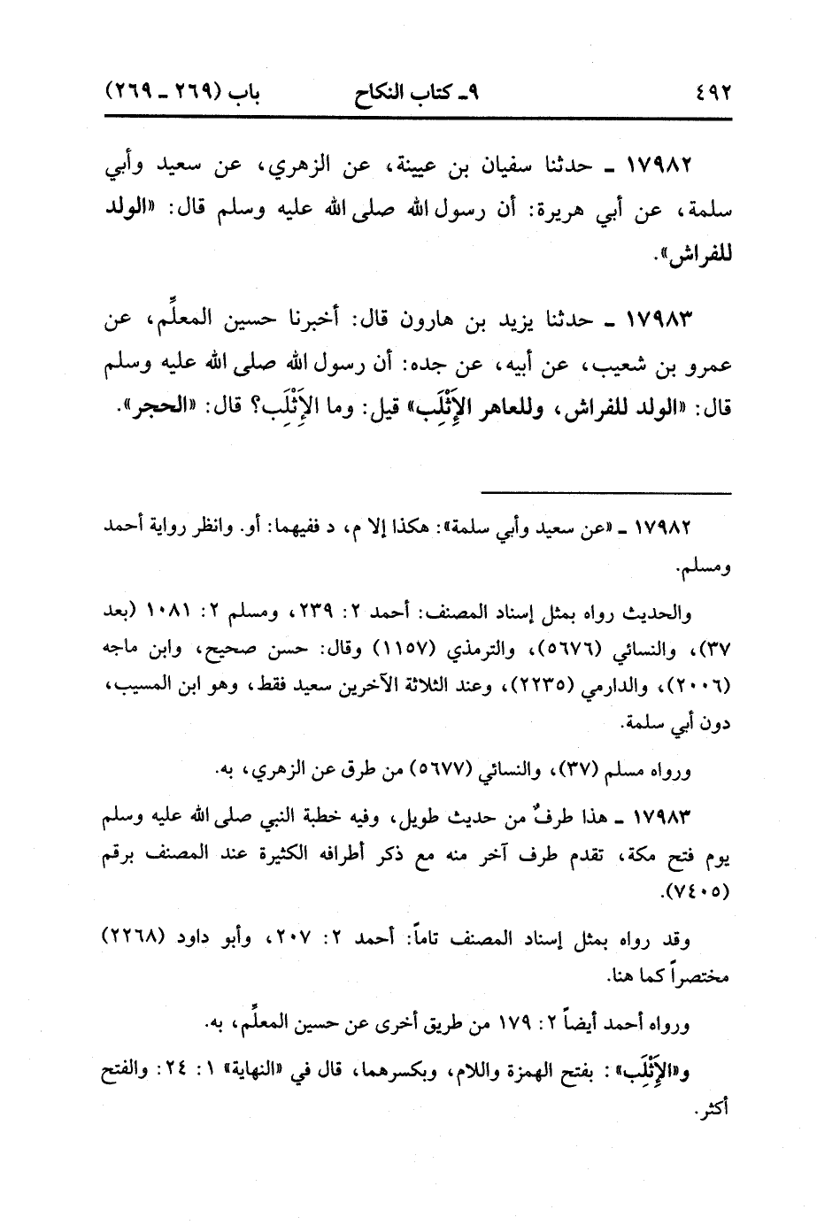 17982- حَدَّثَنَا سُفْيَانُ بْنُ عُيَيْنَةَ , عَنِ الزُّهْرِيِّ , عَنْ سَعِيدٍ وَأَبِي سَلَمَةَ , عَنْ أَبِي هُرَيْرَةَ ، أَنَّ رَسُولَ اللهِ صَلَّى الله عَلَيْهِ وَسَلَّمَ قَالَ : الْوَلَدُ لِلْفِرَاشِ.