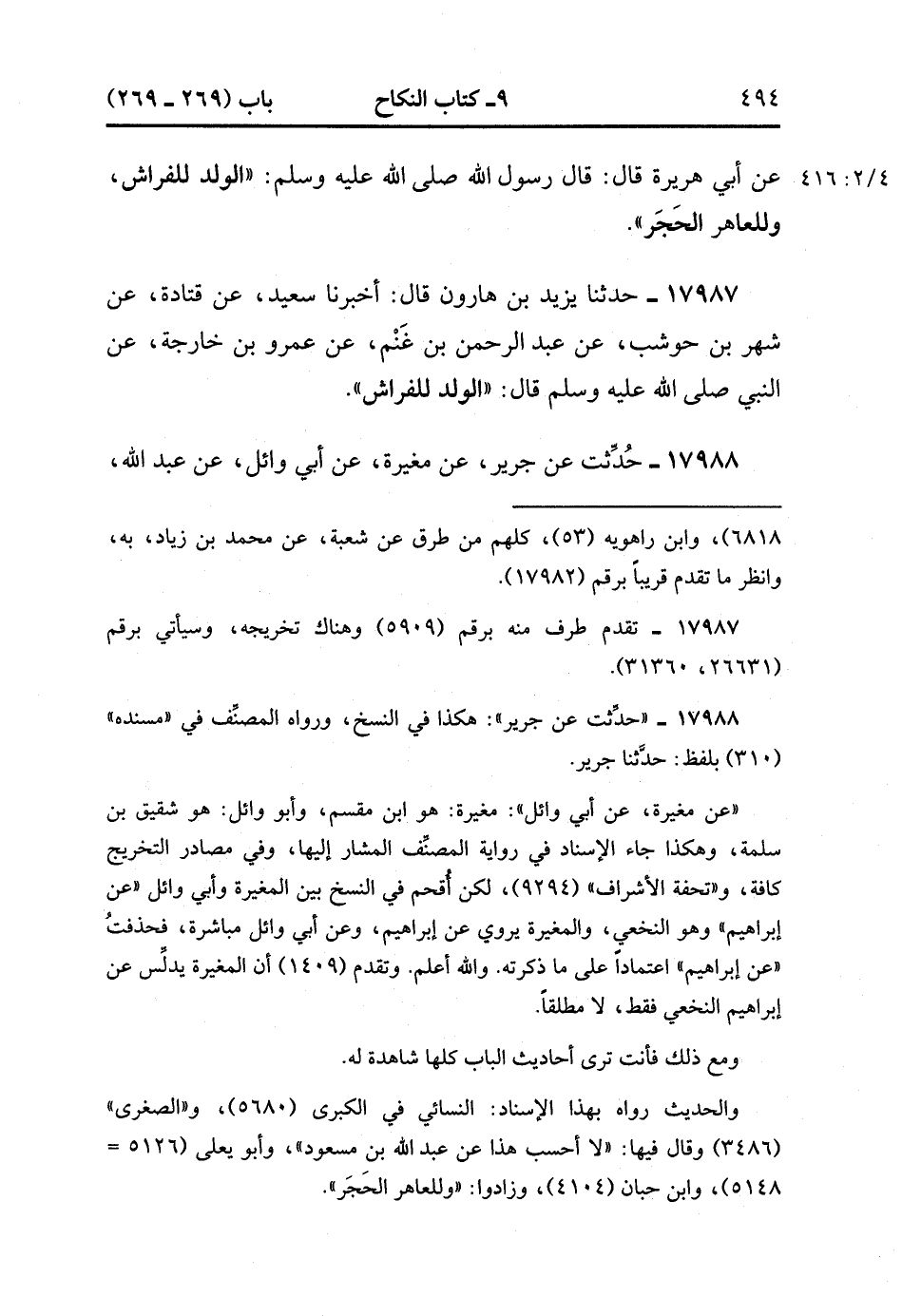 17988- حُدِّثْتُ عَنْ جَرِير , عَنْ مُغِيرَةَ , عَنْ أَبِي وَائِلٍ , عَنْ عَبْدِ اللهِ , عَنِ النَّبِيِّ صَلَّى الله عَلَيْهِ وَسَلَّمَ أَنَّهُ قَالَ : الْوَلَدُ لِلْفِرَاشِ. (4/416:2).