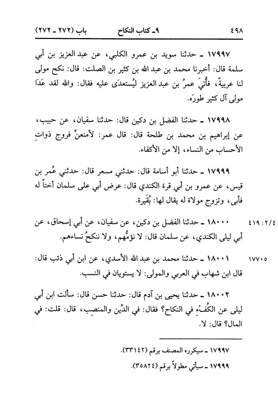 18001- حَدَّثَنَا مُحَمَّدُ بْنُ عَبْدِ اللهِ الأَسَدِيُّ , عَنِ ابْنِ أَبِي ذِئْبٍ قَالَ : قَالَ ابْنُ شِهَابٍ فِي الْعَرَبِيِّ وَالْمَوْلَى : لاَ يَسْتَوِيَانِ فِي النَّسَبِ.