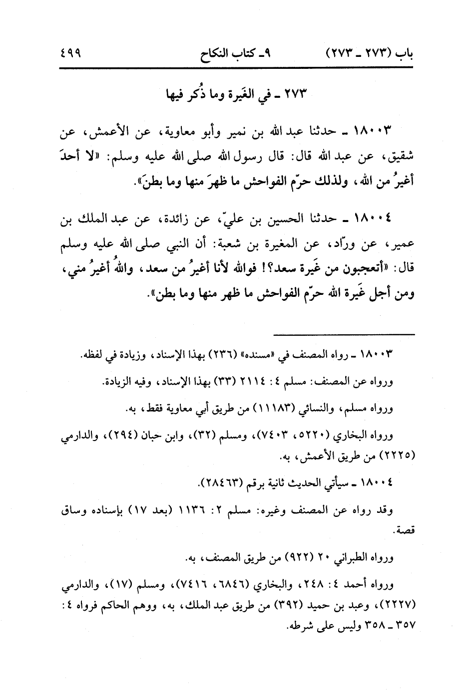 18004- حَدَّثَنَا الْحُسَيْنُ بْنُ عَلِيٍّ , عَنْ زَائِدَةَ , عَنْ عَبْدِ الْمَلِكِ بْنِ عُمَيْرٍ , عَنْ وَرَّادٍ , عَنِ الْمُغِيرَةِ بْنِ شُعْبَةَ أَنَّ النَّبِيَّ صَلَّى الله عَلَيْهِ وَسَلَّمَ قَالَ أَتَعْجَبُونَ مِنْ غَيْرَةِ سَعْدٍ ؟ فَوَاللَّهِ لأَنَا أَغْيَرُ مِنْ سَعْدٍ وَاللَّهُ أَغْيَرُ مِنِّي وَمن أَجْلِ غَيْرَةِ اللهِ حَرَّمَ الْفَوَاحِشَ مَا ظَهَرَ مِنْهَا ، وَمَا بَطَنَ. (4/419:2).