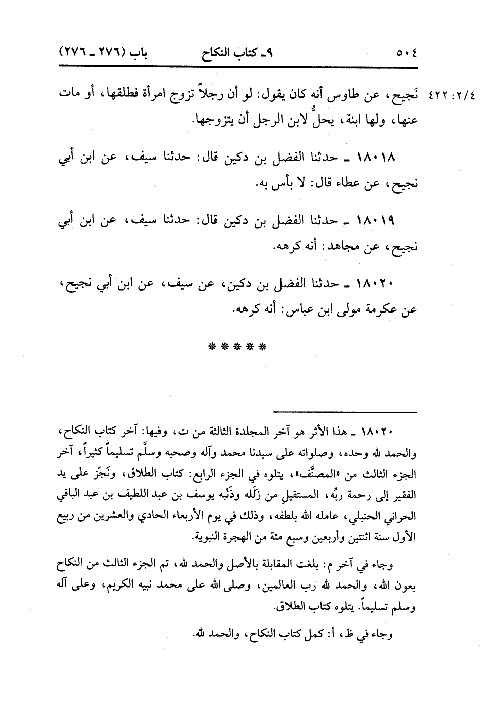 18017- حدَّثَنَا الْفَضْلُ بْنُ دُكَيْنٍ , قَالَ : حدَّثَنَا سَيْفٌ , عَنِ ابْنِ أَبِي نَجِيحٍ , عَنْ طَاوُوسٍ ، أَنَّهُ كَانَ يَقُولُ : لو أنَّ رَجُلاً تَزَوَّجَ امْرَأَةً فَطَلَّقَهَا ، أَوْ مَاتَ عَنْهَا وَلَهَا ابْنَةٌ ، يَحِلُّ لاِبْنِ الرَّجُلِ أَنْ يَتَزَوَّجَهَا. (4/421:2)