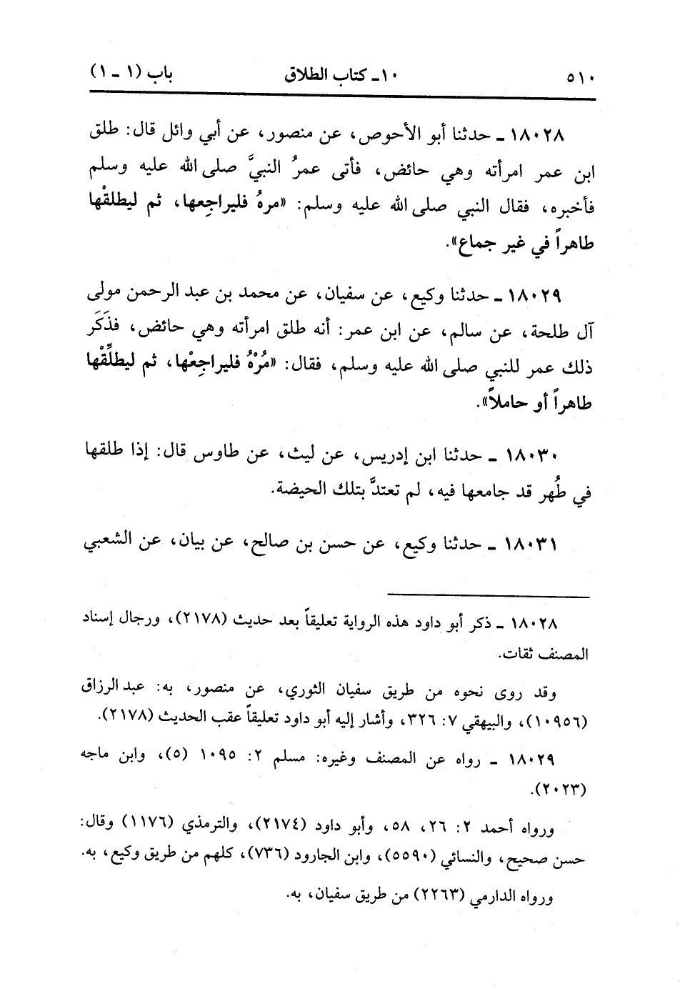 18029- حَدَّثَنَا وَكِيعٌ ، عَنْ سُفْيَانَ ، عَنْ مُحَمَّدِ بْنِ عَبْدِ الرَّحْمَنِ ، مَوْلَى آلِ طَلْحَةَ ، عَنْ سَالِمٍ ، عَنِ ابْنِ عُمَرَ ؛ أَنَّهُ طَلَّقَ امْرَأَتَهُ وَهِيَ حَائِضٌ ، فَذَكَرَ ذَلِكَ عُمَرُ لِلنَّبِيِّ صَلَّى الله عَلَيْهِ وَسَلَّمَ فَقَالَ : مُرْهُ فَلْيُرَاجِعْهَا ثُمَّ لِيُطَلِّقْهَا طَاهِرًا ، أَوْ حَامِلاً.