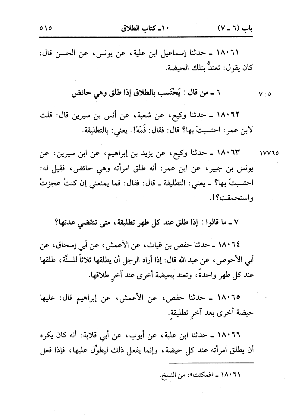 18064- حَدَّثَنَا حَفْصُ بْنُ غِيَاثٍ ، عَنِ الأَعْمَشِِ ، عَنْ أَبِي إِسْحَاقَ ، عَنْ أَبِي الأَحْوَصِ ، عَنْ عَبْدِ اللهِ قَالَ : إذَا أَرَادَ الرَّجُلُ أَنْ يُطَلِّقَهَا ثَلاَثًا لِلسُّنَّةِ ، طَلَّقَهَا عِنْدَ كُلِّ طُهْرٍ وَاحِدَةً ، وَتَعْتَدُّ بِحَيْضَةٍ أُخْرَى عِنْدَ آخِرِ طَلاَقِهَا.