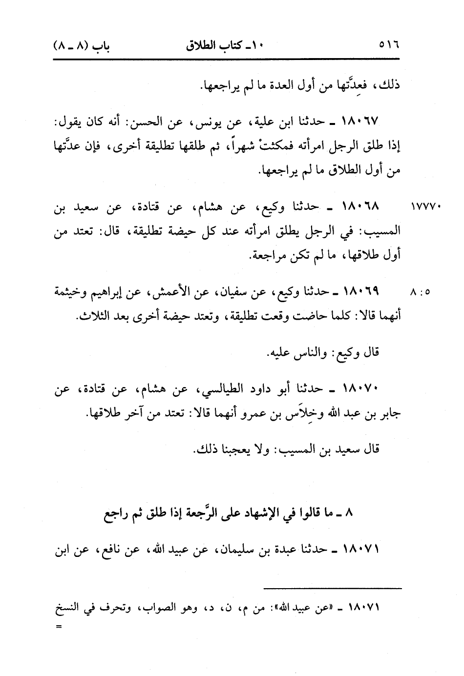 18071- حَدَّثَنَا عَبْدَةُ بْنُ سُلَيْمَانَ ، عَنْ عُبَيْدِ اللهِ ، عَنْ نَافِعٍ ، عَنِ ابْنِ عُمَرَ ؛ أَنَّهُ أَشْهَدَ عَلَى رَجْعَةِ صَفِيَّةَ حِينَ رَاجَعَهَا. (5/8).