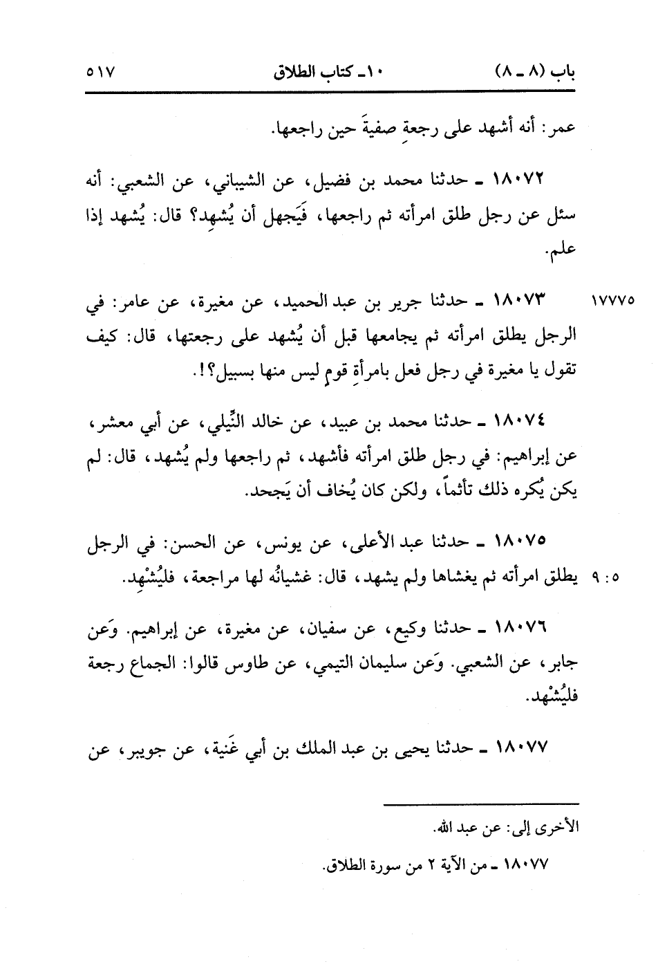 18077- حَدَّثَنَا يَحْيَى بْنُ عَبْدِ الْمَلِكِ بْنِ أَبِي غَنِيَّةَ ، عَنْ جُوَيْبِرٍ ، عَنِ الضَّحَّاكِ ؛ فِي قَوْلِهِ : {وَأَشْهِدُوا ذَوَيْ عَدْلٍ مِنْكُمْ} قَالَ : أُمِرُوا أَنْ يُشْهِدُوا عِنْدَ الطَّلاَقِ وَالرَّجْعَةِ. (5/9).