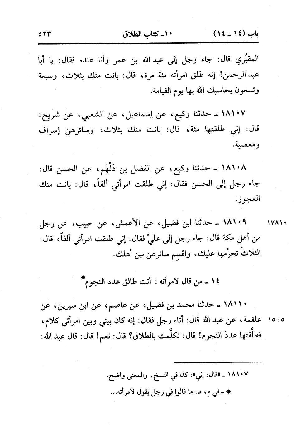 18109- حَدَّثَنَا ابْنُ فُضَيْلٍ ، عَنِ الأَعْمَشِِ ، عَنْ حَبِيبٍ ، عَنْ رَجُلٍ مِنْ أَهْلِ مَكَّةَ ، قَالَ : جَاءَ رَجُلٌ إلَى عَلِيٍّ فَقَالَ : إنِّي طَلَّقْت امْرَأَتِي أَلْفًا ؟ قَالَ : الثَّلاَثُ تُحَرِّمُهَا عَلَيْك ، وَاقْسِمْ سَائِرَهُنَّ بَيْنَ أَهْلِك. (5/14).