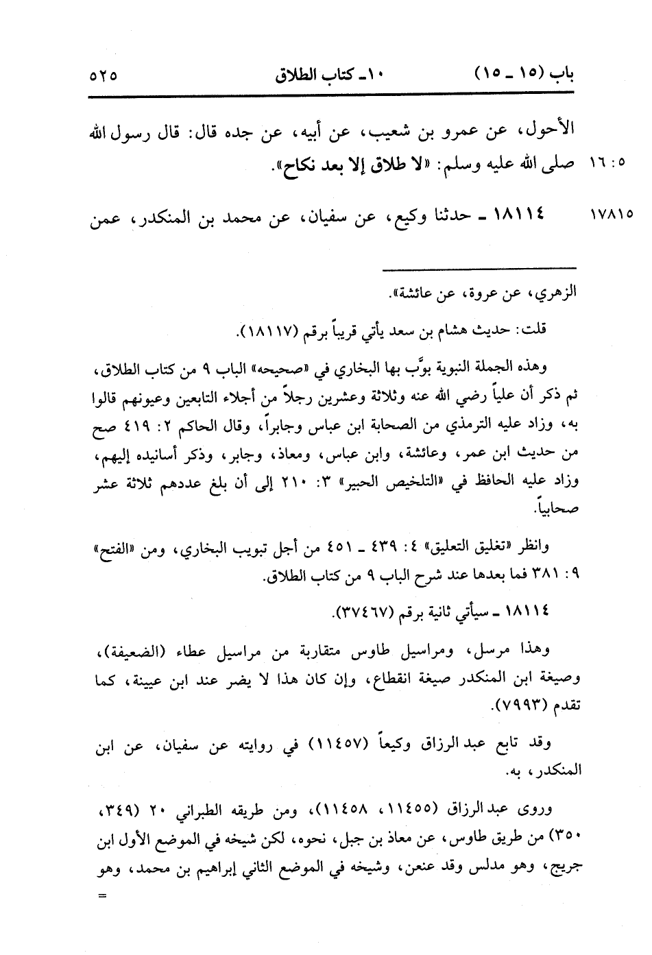 18113- حَدَّثَنَا عَبْدُ الْعَزِيزِ بْنُ عَبْدِ الصَّمَدِ الْعَمِّيِّ ، عَنْ عَامِرٍ الأَحْوَلِ ، عَنْ عَمْرِو بْنِ شُعَيْبٍ ، عَنْ أَبِيهِ ، عَنْ جَدِّهِ ، قَالَ : قَالَ رَسُولُ اللهِ صَلَّى الله عَلَيْهِ وَسَلَّمَ : لاَ طَلاَقَ إلاَّ بَعْدَ نِكَاحِ. (5/15).