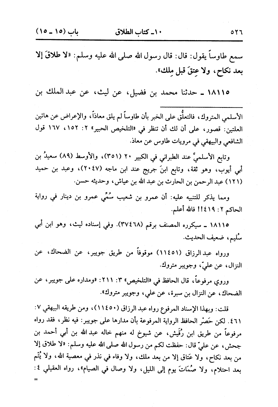 18115- حَدَّثَنَا مُحَمَّدُ بْنُ فُضَيْلٍ ، عَنْ لَيْثٍ ، عَنْ عَبْدِ الْمَلِكِ بْنِ مَيْسَرَةَ ، عنِ النَّزَّالِ ، عَنْ عَلِيٍّ ، قَالَ : لاَ طَلاَقَ إلاَّ مِنْ بَعْدَ النِّكَاحِ. (5/16).