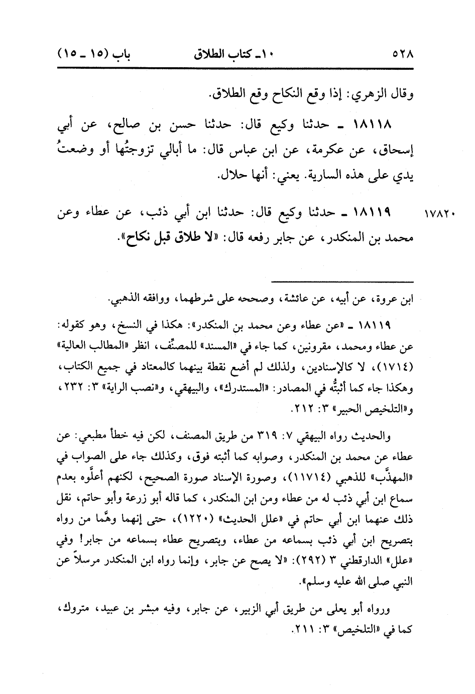 18119- حَدَّثَنَا وَكِيعٌ , قَالَ : حدَّثَنَا ابْنُ أَبِي ذِئْبٍ ، عَنْ عَطَاءٍ ، وَعَنْ مُحَمَّدِ بْنِ الْمُنْكَدِرِ ، عَنْ جَابِرٍ ، رَفَعَهُ ؛ قَالَ : لاَ طَلاَقَ قَبْلَ نِكَاحٍ. (5/16).