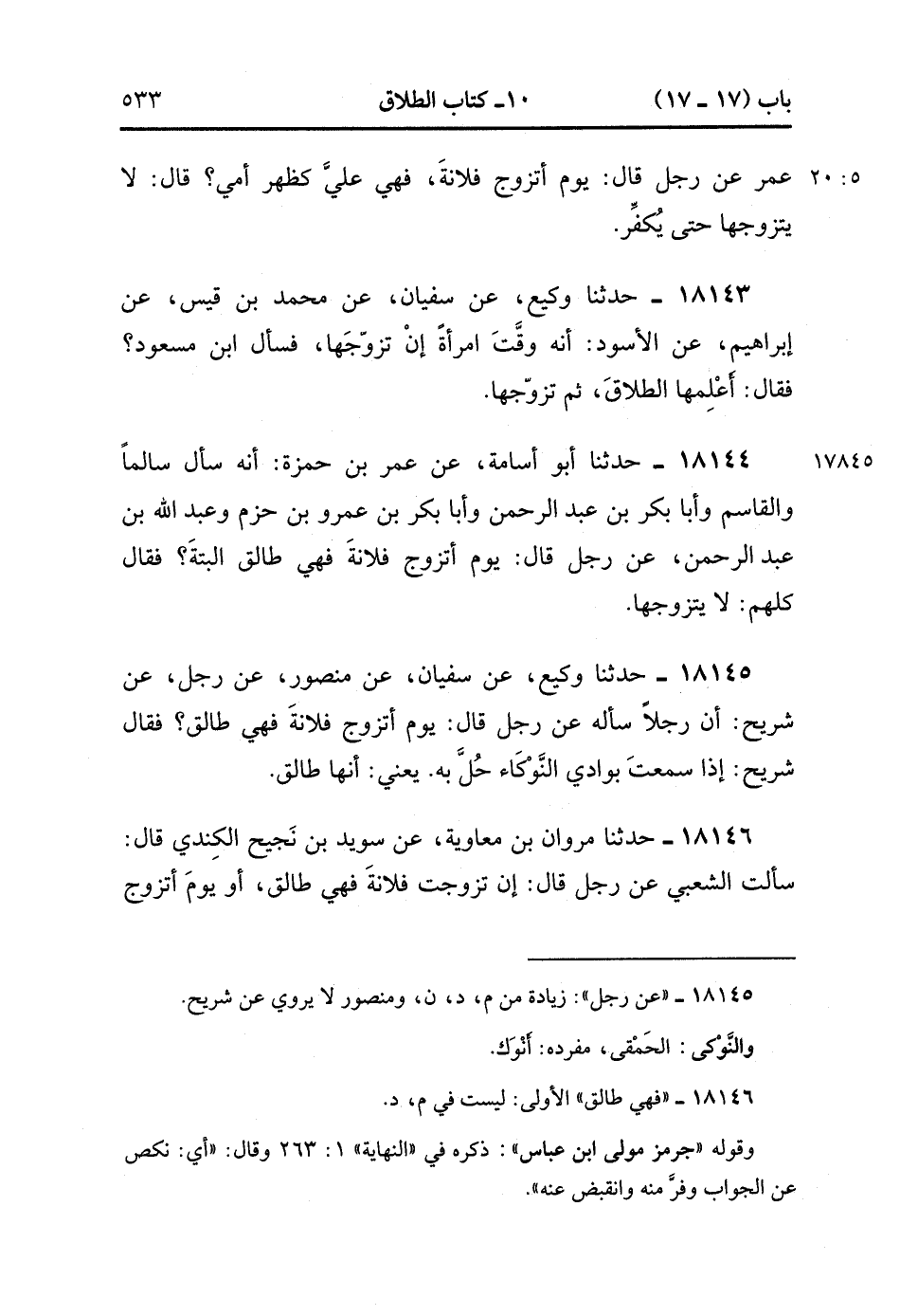 18145- حَدَّثَنَا وَكِيعٌ ، عَنْ سُفْيَانَ ، عَنْ مَنْصُورٍ ، عَنْ رَجُل ، عَنْ شُرَيْحٍ ؛ أَنَّ رَجُلاً سَأَلَهُ عَنْ رَجُلٍ قَالَ : يَوْمَ أَتَزَوَّجُ فُلاَنَةَ فَهِيَ طَالِقٌ ؟ فَقَالَ شُرَيْحٌ : إذَا سَمِعَتَ بَوَادِيَ النِّوْكَاء حُلَّ بِه ، يَعْنِي أَنَّهَا طَالِقٌ.