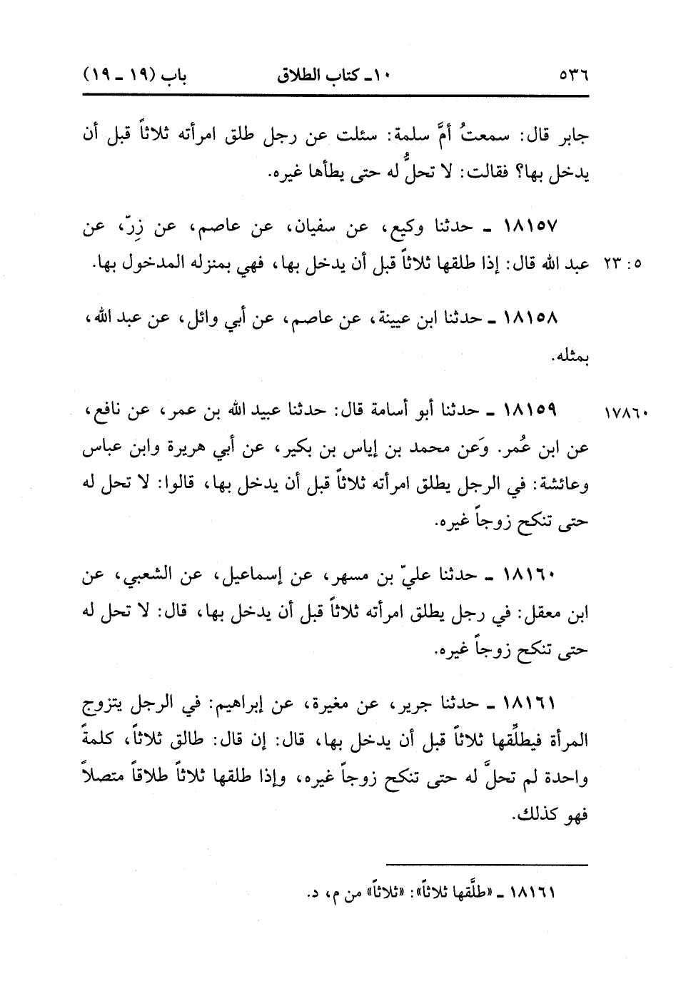 18161- حَدَّثَنَا جَرِيرٌ ، عَنْ مُغِيرَةَ ، عَنْ إبْرَاهِيمَ ؛ فِي الرَّجُلِ يَتَزَوَّجُ الْمَرْأَةَ فَيُطَلِّقُهَا ثَلاَثًا قَبْلَ أَنْ يَدْخُلَ بِهَا ، قَالَ : إِنْ قَالَ طَالِقٌ ثَلاَثًا ، كَلِمَةً وَاحِدَةً ، لَمْ تَحِلَّ لَهُ حَتَّى تَنْكِحَ زَوْجًا غَيْرَهُ ، وَإِذَا طَلَّقَهَا ثَلاَثًا طَلاَقًا مُتَّصِلاً فَهُوَ كَذَلِكَ. (5/23).