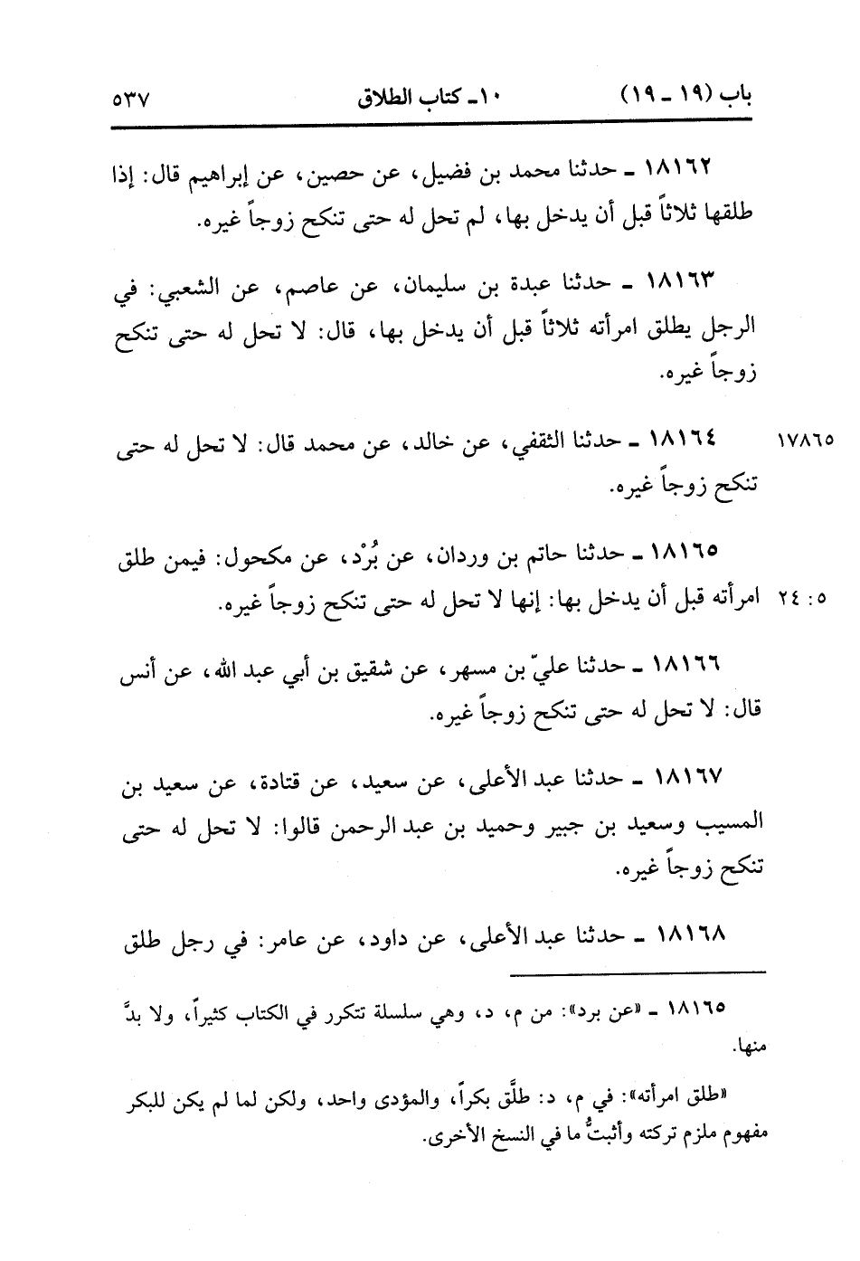 18164- حَدَّثَنَا الثَّقَفِيُّ ، عَنْ خَالِدٍ ، عَنْ مُحَمَّدٍ ، قَالَ : لاَ تَحِلُّ لَهُ حَتَّى تَنْكِحَ زَوْجًا غَيْرَهُ.