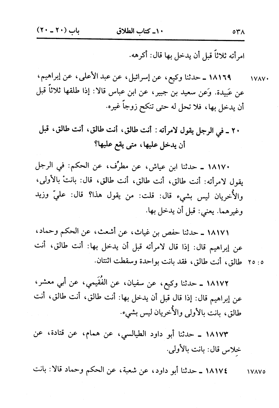 18170- حَدَّثَنَا ابْنُ عَيّاشٍ ، عَنْ مُطَرِّفٍ ، عَنِ الْحَكَمِ ؛ فِي الرَّجُلِ يَقُولُ لاِمْرَأَتِهِ : أَنْتِ طَالِقٌ أَنْتِ طَالِقٌ ، أَنْتِ طَالِقٌ ، قَالَ : بَانَتْ بِالأُولَى وَالأُخْرَيَانِ لَيْسَ بِشَيْءٍ ، قَالَ : قُلْتُ : مَنْ يَقُولُ هَذَا ؟ قَالَ : عَلِيٌّ ، وَزَيْدٌ ، وَغَيْرُهُمَا ، يَعْنِي قَبْلَ أَنْ يَدْخُلَ بِهَا.