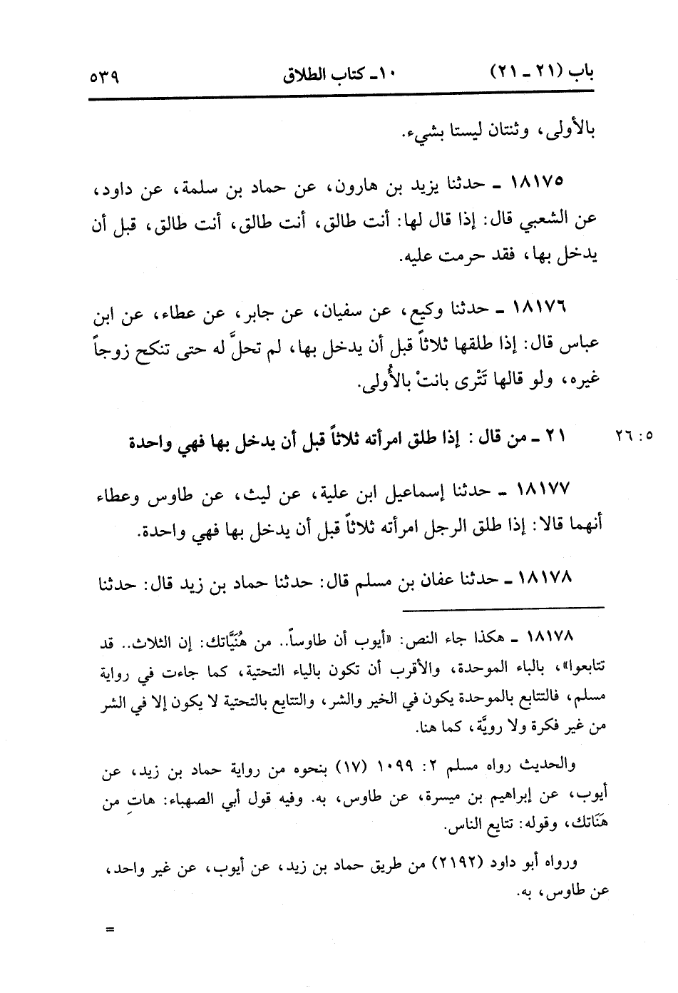 18177- حَدَّثَنَا إسْمَاعِيلُ ابْنُ عُلَيَّةَ ، عَنْ لَيْثٍ ، عَنْ طَاوُوسٍ ، وَعَطَاءٍ ، أَنَّهُمَا قَالاَ : إذَا طَلَّقَ الرَّجُلُ امْرَأَتَهُ ثَلاَثًا قَبْلَ أَنْ يَدْخُلَ بِهَا ، فَهِيَ وَاحِدَةٌ. (5/26).