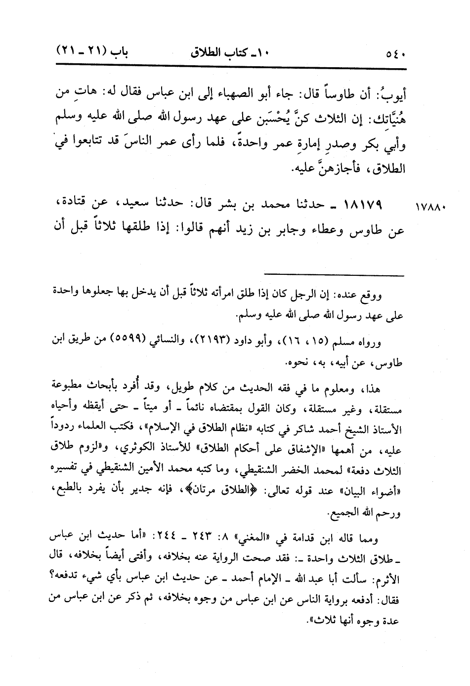 18178- حَدَّثَنَا عَفَّانُ بْنُ مُسْلِمٍ , قَالَ : حدَّثَنَا حَمَّادُ بْنُ زَيْدٍ ، قَالَ : حَدَّثَنَا أَيُّوبُ ؛ أَنَّ طَاوُوسًا قَالَ : جَاءَ أَبُو الصَّهْبَاءِ إلَى ابْنِ عَبَّاسٍ فَقَالَ لَهُ : هَاتِ مِنْ هُنْيَّاتِكَ ، (قال : ) إنَّ الثَّلاَثَ كُنَّ يُحْسَبْنَ عَلَى عَهْدِ رَسُولِ اللهِ صَلَّى الله عَلَيْهِ وَسَلَّمَ وَأَبِي بَكْرٍ وَصَدْرِ إمَارَةِ عُمَرَ وَاحِدَةً ، فَلَمَّا رَأَى عُمَرُ النَّاسَ قَدْ تَتَابَعُوا فِي الطَّلاَقِ ، فَأَجَازَهُنَّ عَلَيْهِ.