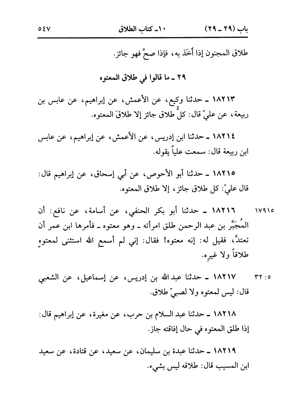 18215- حَدَّثَنَا أَبُو الأَحْوَصِِ ، عَنْ أَبِي إِسْحَاقَ ، عَنْ إبْرَاهِيمَ ، قَالَ : قَالَ عَلِيٌّ : كُلُّ طَلاَقٍ جَائِزٌ ، إلاَّ طَلاَقَ الْمَعْتُوهِ.