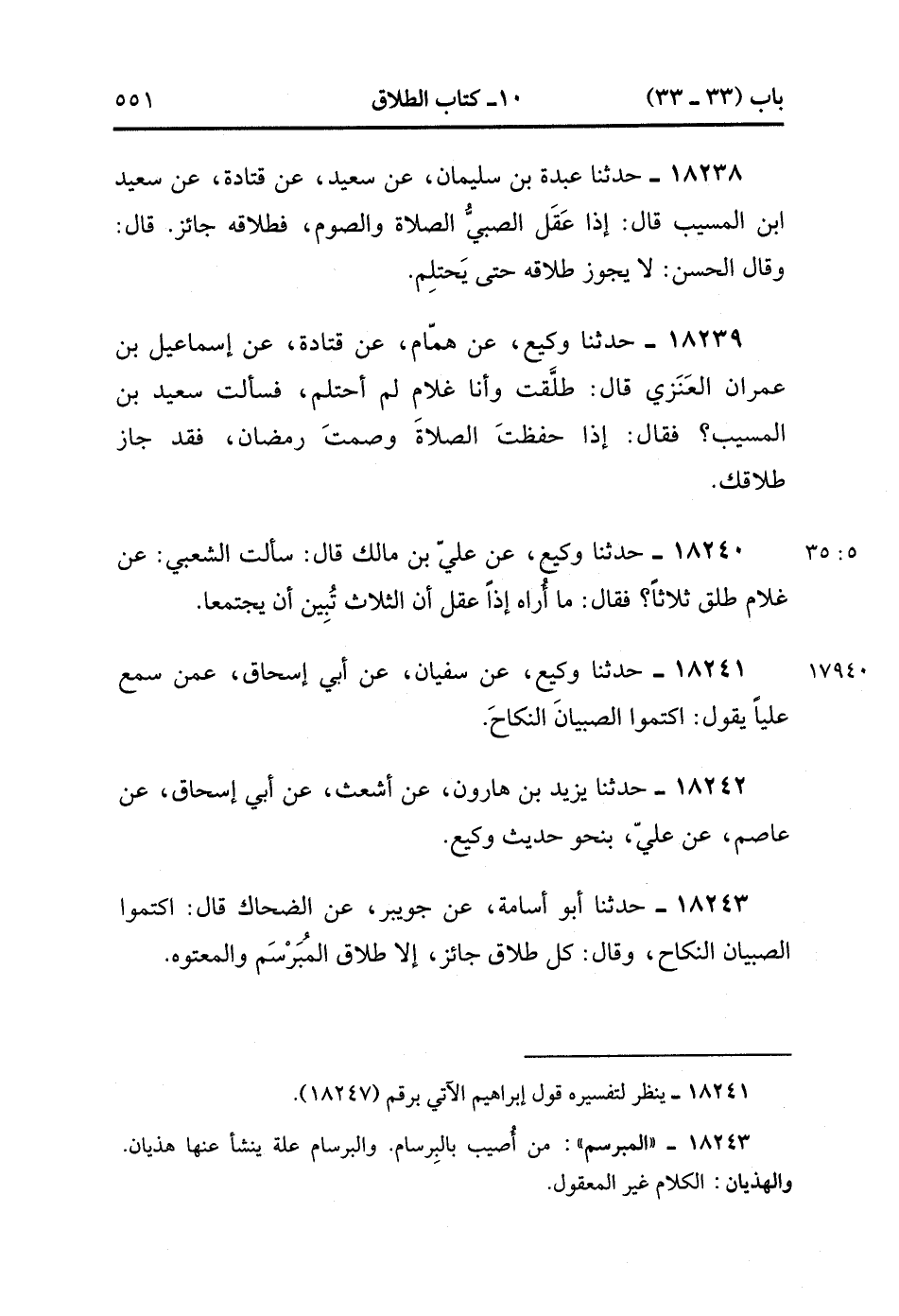 18243- حَدَّثَنَا أَبُو أُسَامَةَ ، عَنْ جُوَيْبِرٍ ، عَنِ الضَّحَّاكِ ، قَالَ : اكْتُمُوا الصِّبْيَانَ النِّكَاحَ ، وَقَالَ : كُل طَلاَقٍ جَائِزٌ ، إلاَّ طَلاَقَ الْمُبَرْسَمِ وَالْمَعْتُوهِ. (5/35).