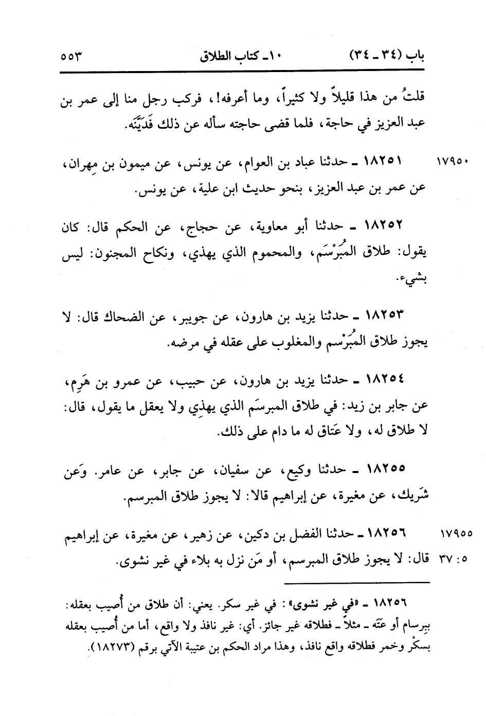 18254- حَدَّثَنَا يَزِيدُ بْنُ هَارُونَ ، عَنْ حَبِيبٍ ، عَنْ عَمْرُو بْنِ هَرْمٍ ، عَنْ جَابِرِ بْنِ زَيْدٍ ؛ فِي طَلاَقِ الْمُبَرْسَمِ الَّذِي يَهْذِي وَلاَ يَعْقِلُ ، مَا يَقُولُ ، قَالَ : لاَ طَلاَقَ لَهُ ، وَلاَ عِتَاقَ لَهُ مَادَام عَلَى ذَلِك.