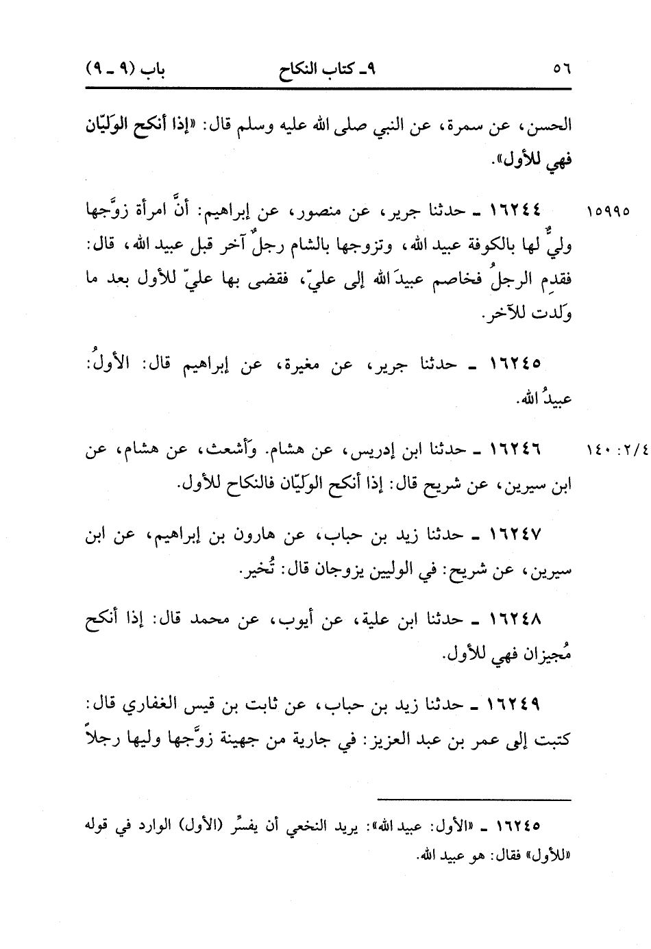 16245- حَدَّثَنَا جَرِيرٌ , عَنْ مُغِيرَةَ , عَنْ إبْرَاهِيمَ قَالَ : اِلأَوَّلِ عُبَيْدِ اللهِ. (4/139:2)