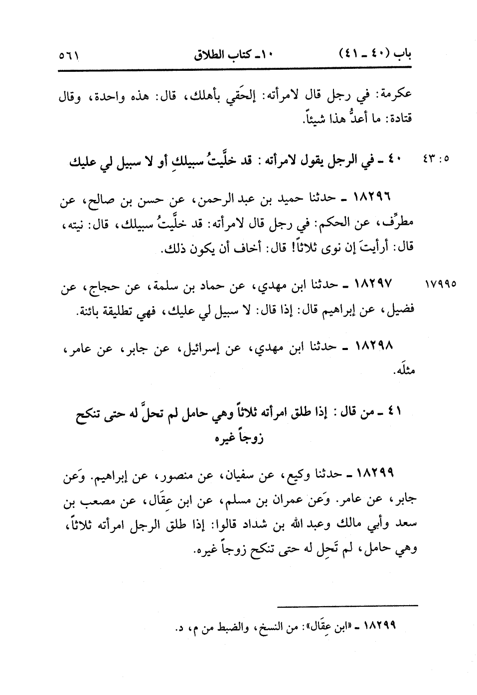 18299- حَدَّثَنَا وَكِيعٌ ، عَنْ سُفْيَانَ ، عَنْ مَنْصُورٍ ، عَنْ إبْرَاهِيمَ (ح) وَعَنْ جَابِرٍ ، عَنْ عَامِرٍ (ح) وَعَنْ عِمْرَانَ بْنِ مُسْلِمٍ ، عَنِ ابْنِ عِقَال ، عَنْ مُصْعَبِ بْنِ سَعْدٍ ، وَأَبِي مَالِكٍ ، وَعَبْدِ اللهِ بْنِ شَدَّادٍ قَالُوا : إذَا طَلَّقَ الرَّجُلُ امْرَأَتَهُ ثَلاَثًا وَهِيَ حَامِلٌ ، لَمْ تَحِلَّ لَهُ حَتَّى تَنْكِحَ زَوْجًا غَيْرَهُ. (5/43).