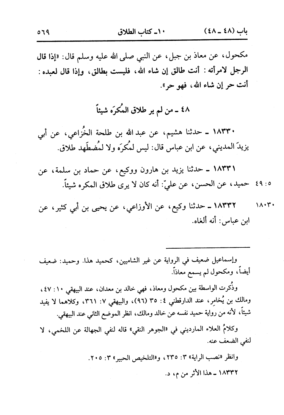 18330- حَدَّثَنَا هُشَيْمٌ ، عَنْ عَبْدِ اللهِ بْنِ طَلْحَةَ الْخُزَاعِيِّ ، عَنِ أَبِي يَزِيدَ الْمَدِينِيِّ ، عَنِ ابْنِ عَبَّاسٍ ، قَالَ : لَيْسَ لِمُكْرَهٍ وَلاَ لِمُضْطَهَدٍ طَلاَقٌ.