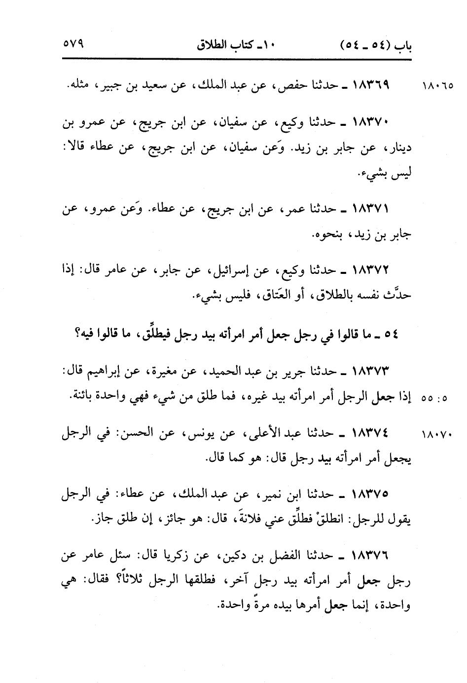 18376- حَدَّثَنَا الْفَضْلُ بْنُ دُكَيْنٍ ، عَنْ زَكَرِيَّا ، قَالَ : سُئِلَ عَامِرٌ عَنْ رَجُلٍ جَعَلَ أَمْرَ امْرَأَتِهِ بِيَدِ رَجُلٍ آخَرَ ، فَطَلَّقَهَا الرَّجُلُ ثَلاَثًا ؟ فَقَالَ : هِيَ وَاحِدَةٌ ، إِنَّمَا جَعَلَ أَمْرَهَا بِيَدِهِ مَرَّةً وَاحِدَةً. (5/55).