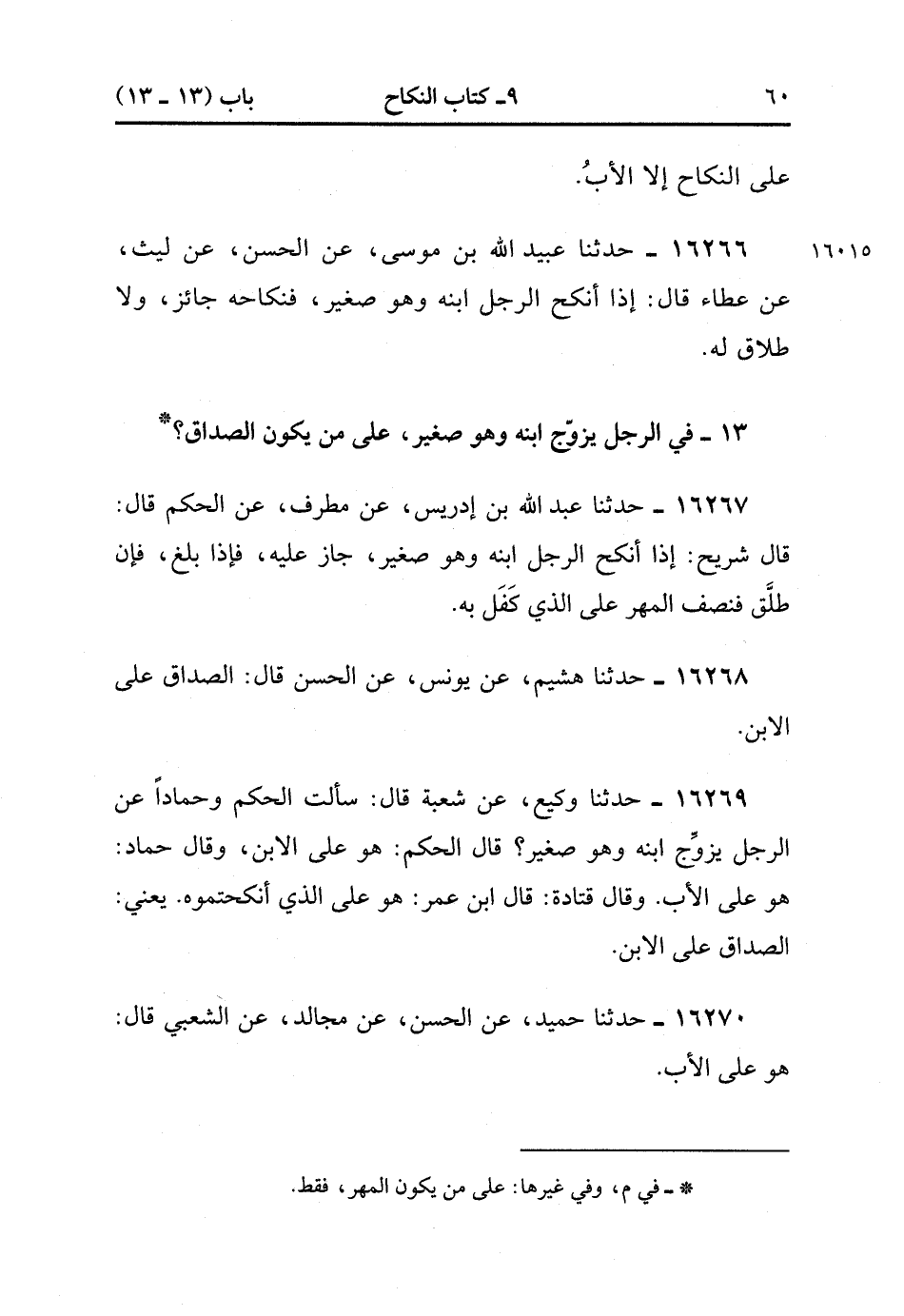 16269- حَدَّثَنَا وَكِيعٌ , عَنْ شُعْبَةَ قَالَ : سَأَلْتُ الْحَكَمَ وَحَمَّادًا , عَنِ الرَّجُلِ يُزَوِّجُ ابْنَهُ وَهُوَ صَغِيرٌ ، قَالَ الْحَكَمُ : هو عَلَى اِلابْنِ، وَقَالَ حَمَّادٌ : هُوَ عَلَى الأَبِ ، وَقَالَ قَتَادَةُ : قَالَ ابْنُ عُمَرَ هُوَ عَلَى الَّذِي أَنْكَحْتُمُوهُ ، يَعْنِي الصَّدَاقَ عَلَى اِلابْنِ.