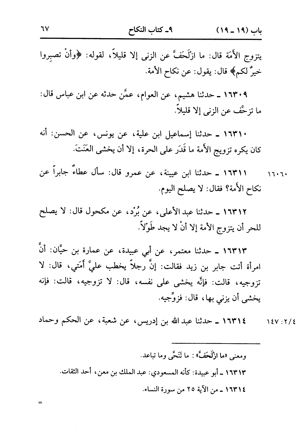 16314- حَدَّثَنَا عَبْدُ اللهِ بْنُ إدْرِيسَ , عَنْ شُعْبَةَ , عَنِ الْحَكَمَ وَحَمَّادٍ سُئِلاَ , عَنْ نِكَاحِ الأَمَةِ فَقَالاَ : {لِمَنْ خَشِيَ الْعَنَتَ مِنْكُمْ}. (4/147:2).