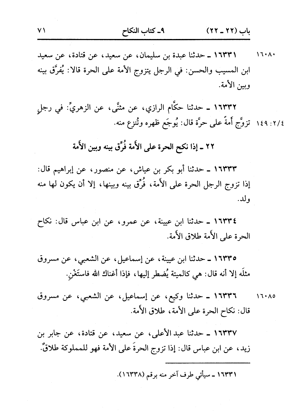 16334- حَدَّثَنَا ابْنُ عُيَيْنَةَ , عَنْ عَمْرٍو , عَنِ ابْنِ عَبَّاسٍ ، قَالَ : نِكَاحُ الْحُرَّةِ عَلَى الأَمَةِ طَلاَقُ الأَمَةِ.