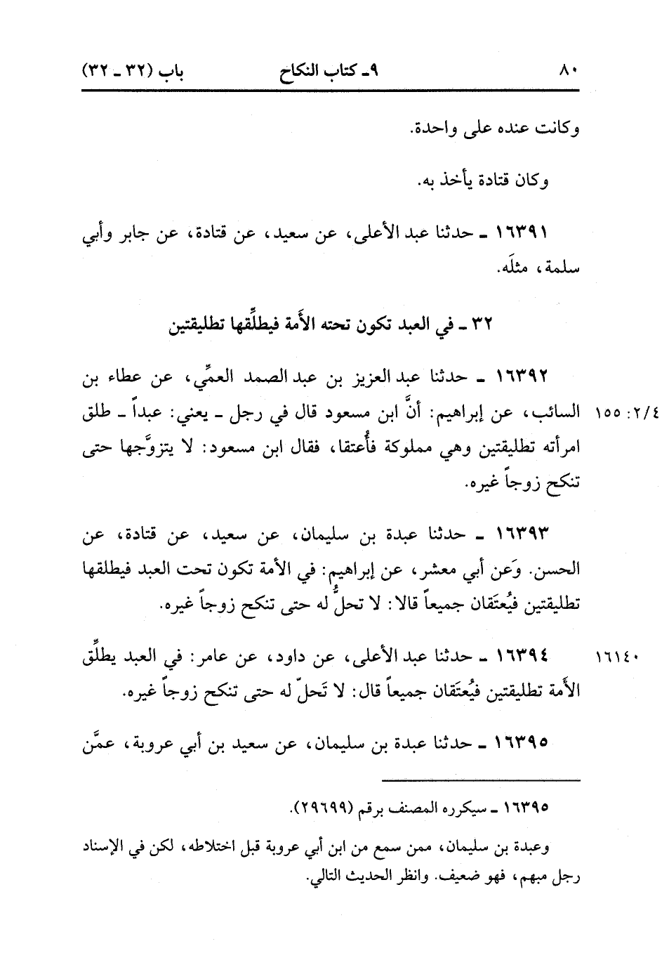 32- في العبد تَكُونُ تَحْتَهُ الأَمَةُ فَيُطَلِّقُهَا تَطْلِيقَتَيْنِ.