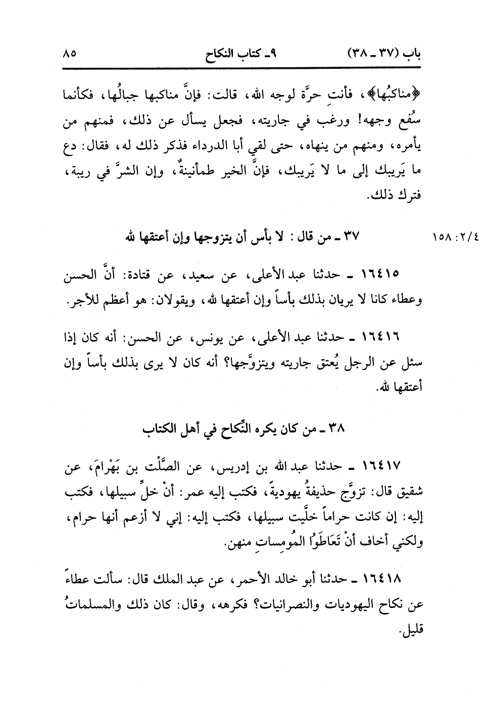 16418- حَدَّثَنَا أَبُو خَالِدٍ الأَحْمَرُ , عَنْ عَبْدِ الْمَلِكِ قَالَ : سَأَلْتُ عَطَاءً , عَنْ نِكَاحِ الْيَهُودِيَّاتِ وَالنَّصْرَانِيَّات فَكَرِهَهُ وَقَالَ : كَانَ ذَلِكَ وَالْمُسْلِمَاتُ قَلِيلٌ. (4/158:2).