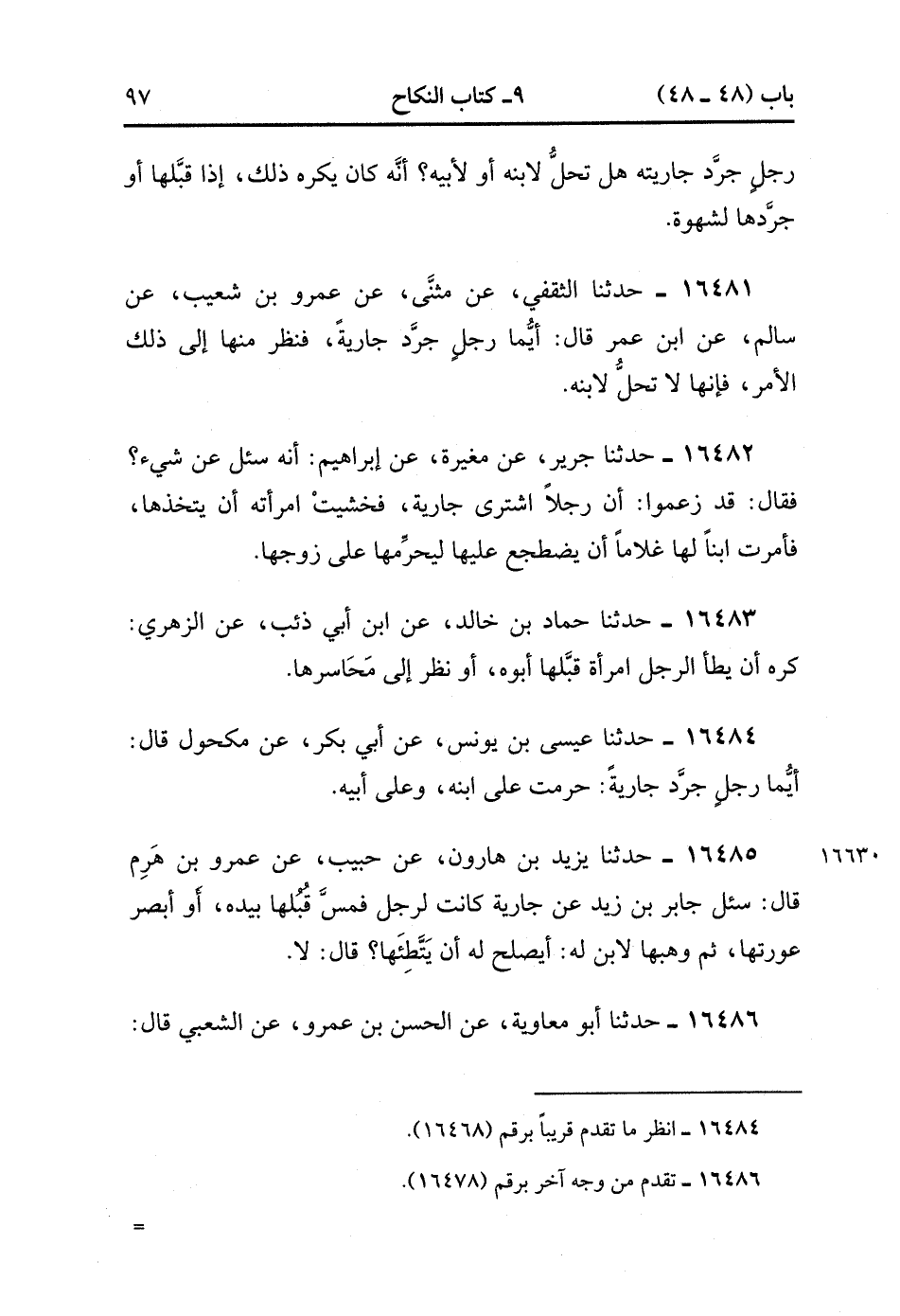 16485- حَدَّثَنَا يَزِيدُ بْنُ هَارُونَ , عَنْ حَبِيبٍ , عَنْ عَمْرِو بْنِ هَرِمٍ قَالَ : سُئِلَ جَابِرُ بْنُ زَيْدٍ , عَنْ جَارِيَةٍ كَانَتْ لِرَجُلٍ فَمَسَّ قُبُلَهَا بِيَدِهِ ، أَوْ أَبْصَرَ عَوْرَتَهَا ثُمَّ وَهَبَهَا لاِبْنٍ لَهُ أَيُصْلِحُّ له أَنْ يَتَّطِئَهَا قَالَ : لاَ. (4/164:2).