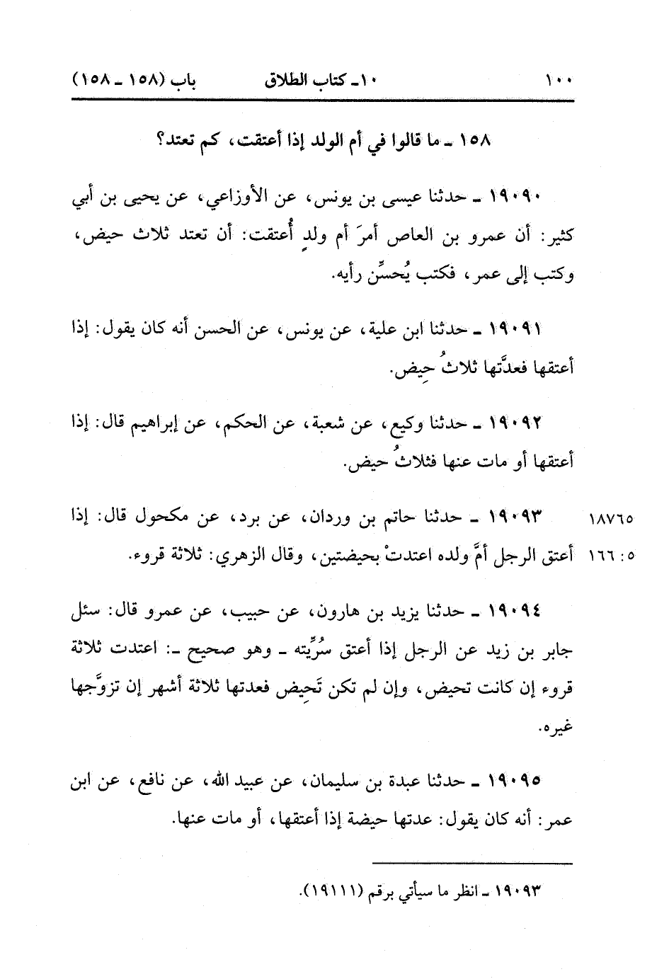19093- حَدَّثَنَا حَاتِمُ بْنُ وَرْدَانَ , عَنْ بُرْدٍ , عَنْ مَكْحُولٍ قَالَ : إذَا أَعْتَقَ الرَّجُلُ أُمَّ وَلَدِهِ اعْتَدَّتْ بِحَيْضَتَيْنِ : وَقَالَ الزُّهْرِيُّ : ثَلاَثَةَ قُرُوءٍ. (5/165).
