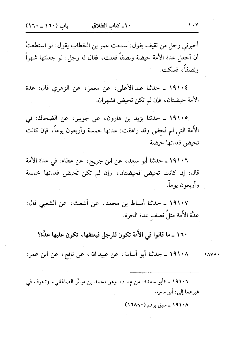 19108- حَدَّثَنَا أَبُو أُسَامَةَ , عَنْ عُبَيْدِ اللهِ , عَنْ نَافِعٍ ، عَنِ ابْنِ عُمَرَ فِي الأَمَةِ الَّتِي تُوطَأُ : إذَا بِيعَتْ ، أَوْ وُهِبَتْ ، أَوْ أُعْتِقَتْ فَلْتُسْتَبْرَأْ بِحَيْضَةٍ. (5/167).