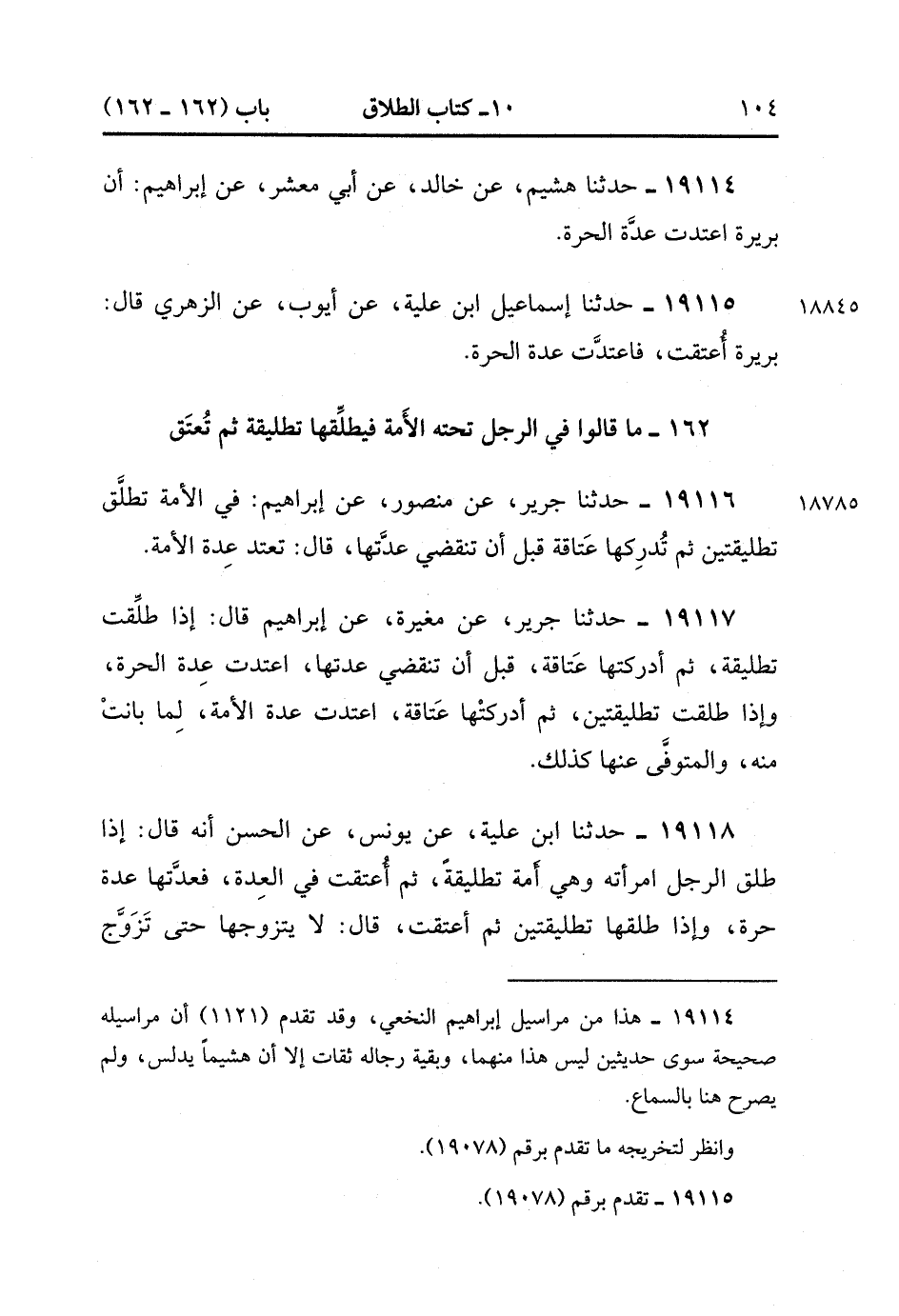 19117- حَدَّثَنَا جَرِيرٌ ، عَنْ مُغِيرَةَ ، عَنْ إبْرَاهِيمَ قَالَ : إذَا طُلِّقَتْ تَطْلِيقَةً , ثُمَّ أَدْرَكَهَا عَتَاقُهُ قَبْلَ أَنْ تَنْقَضِيَ عِدَّتُهَا اعْتَدَّتْ عِدَّةَ الْحُرَّةِ وَإِذَا طَلُقَتْ تَطْلِيقَتَيْنِ , ثُمَّ أَدْرَكَتهَا عَتَاقُهُ اعْتَدَّتْ عِدَّةَ الأَمَةِ لَمَّا بَانَتْ مِنْهُ ، وَالْمُتَوَفَّى عَنْهَا كَذَلِكَ.