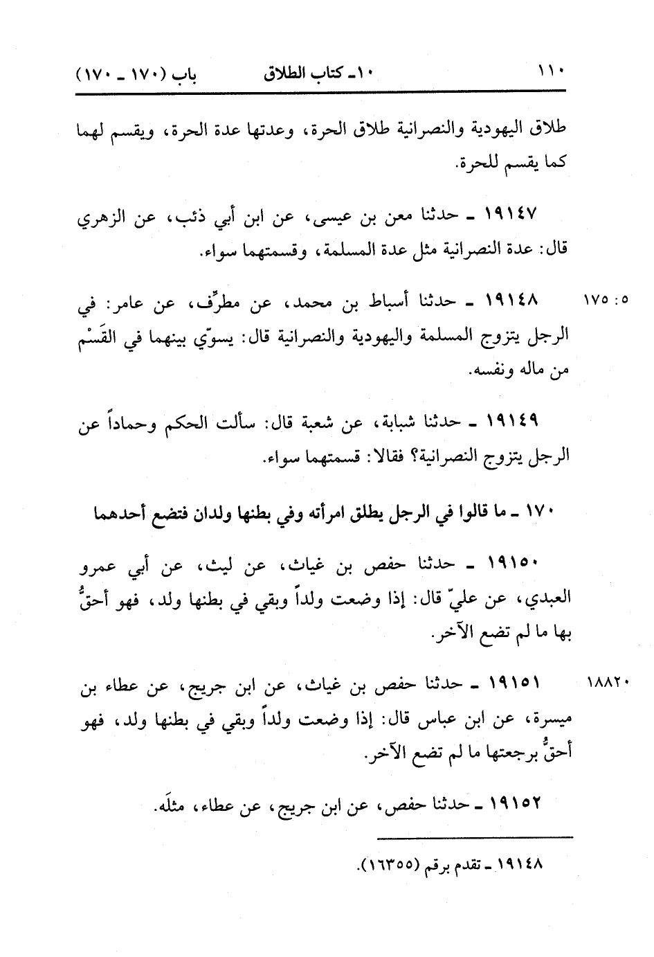19147- حَدَّثَنَا مَعْنُ بْنُ عِيسَى ، عَنِ ابْنِ أَبِي ذِئْبٍ ، عَنِ الزُّهْرِيِّ قَالَ : عِدَّةُ النَّصْرَانِيَّةِ مِثْلُ عِدَّةِ الْمُسْلِمَةِ وَقِسْمَتُهُمَا سَوَاءٌ. (5/174).
