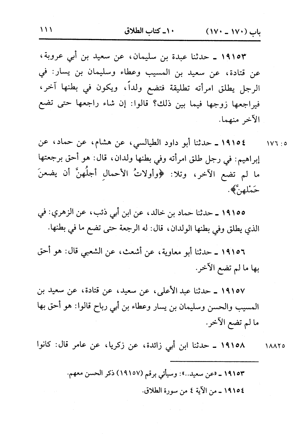 19154- حَدَّثَنَا أَبُو دَاوُدَ الطَّيَالِسِيُّ , عَنْ هِشَامٍ , عَنْ حَمَّادٍ , عَنْ إبْرَاهِيمَ فِي رَجُلٍ طَلَّقَ امْرَأَتَهُ وَفِي بَطْنِهَا وَلَدَانِ ، قَالَ هُوَ أَحَقُّ بِرَجْعَتِهَا مَا لَمْ تَضَعَ الآخَرَ وَتَلاَ : {وَأُولاَتُ الأَحْمَالِ أَجَلُهُنَّ أَنْ يَضَعْنَ حَمْلَهُنَّ}.