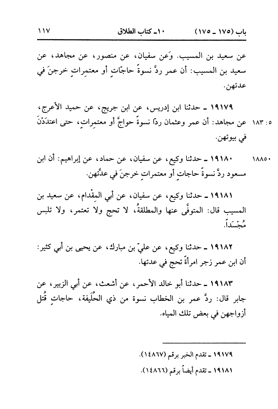 19182- حَدَّثَنَا وَكِيعٌ , عَنْ عَلِيِّ بْنِ مُبَارَكٍ , عَنْ يَحْيَى بْنِ أَبِي كَثِيرٍ أَنَّ ابْنَ عُمَرَ زَجَرَ امْرَأَةً تَحُجُّ فِي عِدَّتِهَا. (5/182).