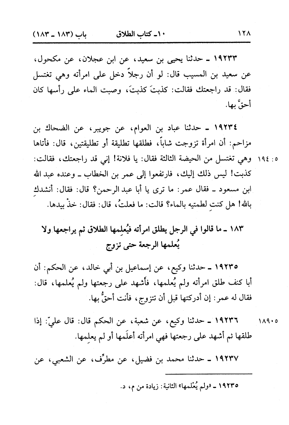 19234- حَدَّثَنَا عَبَّادُ بْنُ الْعَوَّامِ , عَنْ جُوَيْبِرٍ ، عَنِ الضَّحَّاكِ بْنِ مُزَاحِمٍ أَنَّ امْرَأَةً تَزَوَّجَتْ شَابًّا فَطَلَّقَهَا تَطْلِيقَةً ، أَوْ تَطْلِيقَتَيْنِ قَالَ : فَأَتَاهَا وَهِيَ تَغْتَسِلُ مِنَ الْحَيْضَةِ الثَّالِثَةِ فَقَالَ : يَا فُلاَنَةُ إنِّي قَدْ رَاجَعْتُك ، فَقَالَتْ : كَذَبْت ، لَيْسَ ذَلِكَ إلَيْك , فَارْتَفَعُوا إلَى عُمَرَ بْنِ الْخَطَّابِ , وَعِنْدَهُ عَبْدُ اللهِ بْنُ مَسْعُودٍ ، فَقَالَ عُمَرُ : مَا تَرَى يَا أَبَا عَبْدِ الرَّحْمَنِ ؟ قَالَ : فَقَالَ : أَنْشُدُك بِاللَّهِ ، هَلْ كُنْت لَطَمْتِيهِ بِالْمَاءِ ؟ قَالَتْ : مَا فَعَلْت ، قَالَ : فَقَالَ : خُذْ بِيَدِهَا. (5/193).