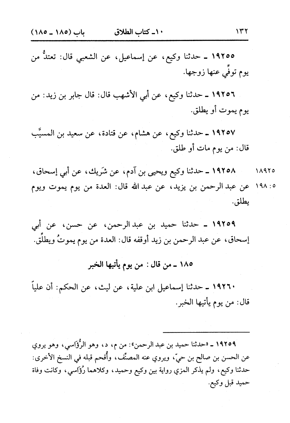 19258- حَدَّثَنَا وَكِيعٌ ، وَيَحْيَى بْنُ آدَمَ , عَنْ شَرِيكٍ , عَنْ أَبِي إِسْحَاقَ , عَنْ عَبْدِ الرَّحْمَنِ بْنِ زَيْدٍ , عَنْ عَبْدِ اللهِ قَالَ : الْعِدَّةُ مِنْ يَوْمِ يَمُوتُ ، ويوم يُطَلِّقُ. (5/197).