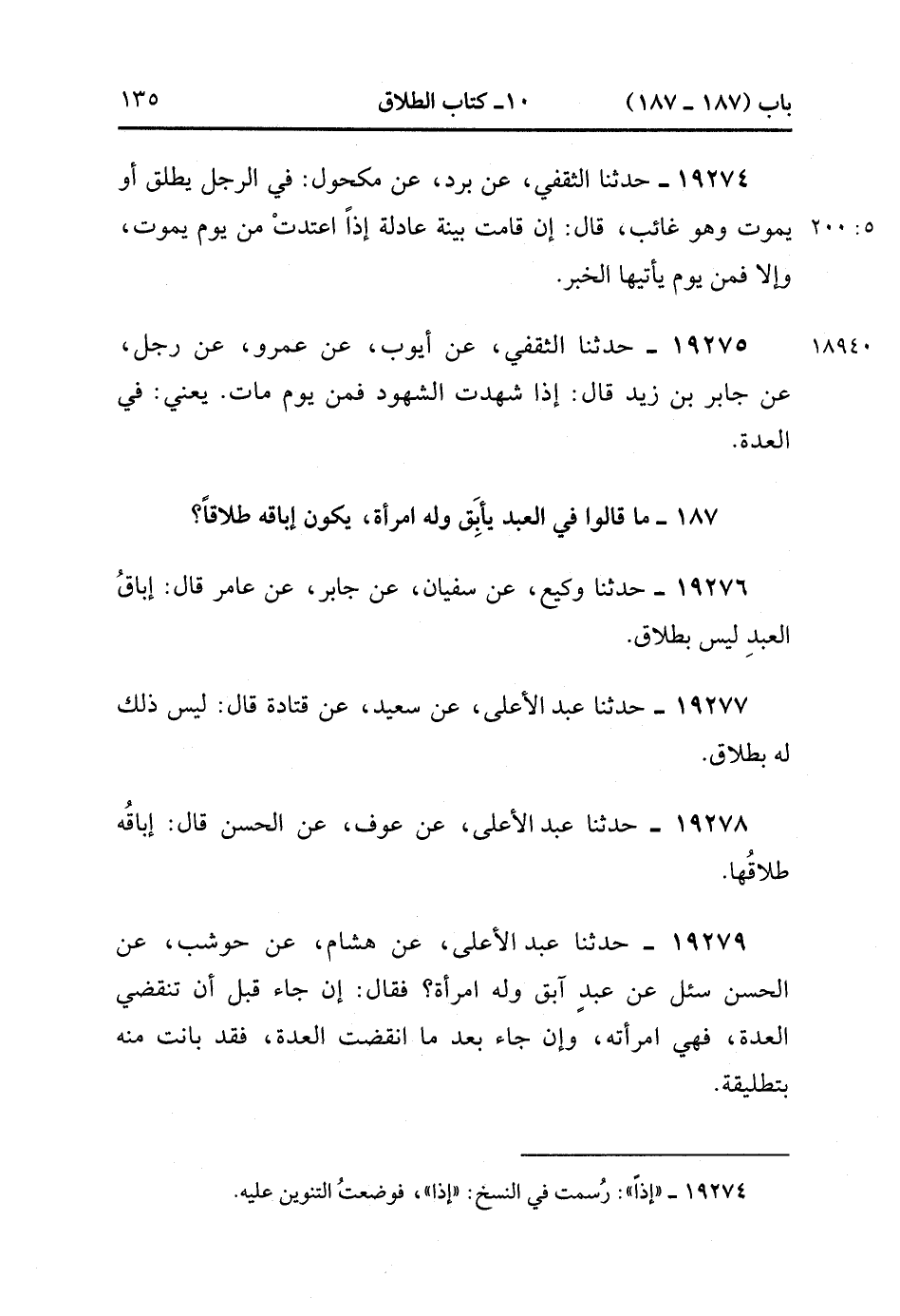 19279- حَدَّثَنَا عَبْدُ الأَعْلَى , عَنْ هِشَامٍ , عَنْ حَوْشَبٍ ، عَنِ الْحَسَنِ سُئِلَ عَنْ عَبْدٍ آبِقٍ وَلَهُ امْرَأَةٌ فَقَالَ : إِنْ جَاءَ قَبْلَ أَنْ تَنْقَضِيَ الْعِدَّةُ فَهِيَ امْرَأَتُهُ , وَإِنْ جَاءَ بَعْدَ مَا انْقَضَتِ الْعِدَّةُ فَقَدْ بَانَتْ مِنْهُ بِتَطْلِيقَةٍ. (5/200).