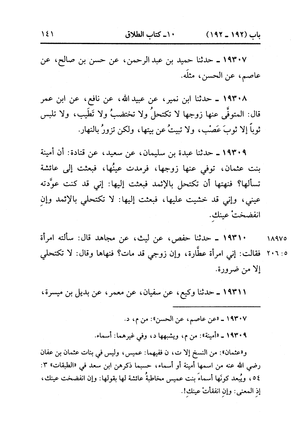 19309- حَدَّثَنَا عَبْدَةُ بْنُ سُلَيْمَانَ , عَنْ سَعِيدٍ ، عَنْ قَتَادَةَ أَنَّ أمينة بِنْتَ عُثْمَانَ تُوُفِّيَ زَوْجُهَا فَرَمِدَتْ عَيْنُهَا , فَبَعَثَتْ إلَى عَائِشَةَ تَسْأَلُهَا , فَنَهَتْهَا أَنْ تَكْتَحِلَ بِالإِثْمِدِ , فَبَعَثَتْ إلَيهَا إنِّي قَد كُنت عَودته عَينِي , وَإِني قَد خَشَيت عَلَيهَا , فَبَعَثَتُ إِلَيهَا لاَ تَكْتَحِلَ بِالإِثْمِدِ , وَإِنْ أنْفَضَختْ عَيْنُك. (5/205).