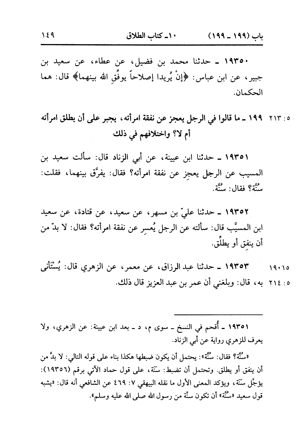 19351- حَدَّثَنَا ابْنُ عُيَيْنَةَ ، عَنِ الزُّهْرِيِّ , عَنْ أَبِي الزِّنَادِ قَالَ : سَأَلْتُ سَعِيدَ بْنَ الْمُسَيَّبِ عَنِ الرَّجُلِ يَعْجِزُ عَنْ نَفَقَةِ امْرَأَتِهِ فَقَالَ : يُفَرَّقُ بَيْنَهُمَا فَقُلْت : سُنَّةً ؟ فَقَالَ : سُنَّةً.