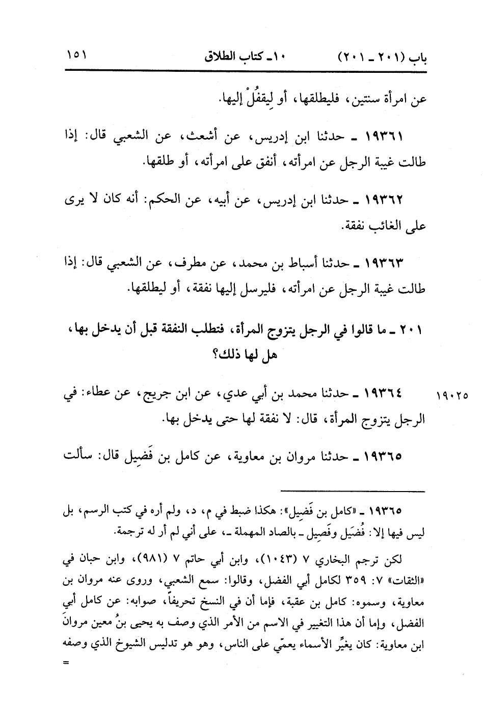 19365- حَدَّثَنَا مَرْوَانُ بْنُ مُعَاوِيَةَ , عَنْ كَامِلِ بْنِ فُضَيْلٍ قَالَ : سَأَلْتُ الشَّعْبِيَّ عَنْ رَجُلٍ تَزَوَّجَ امْرَأَةً فَلَمْ يَدْخُلْ بِهَا , ثُمَّ غَابَ عَنْهَا فَلَمَّا قَدِمَ أَخَذَتْهُ بِالنَّفَقَةِ ، فَقَالَ الشَّعْبِيُّ : لاَ نَفَقَةَ لَهَا حَتَّى يَدْخُلَ بِهَا. (5/215).