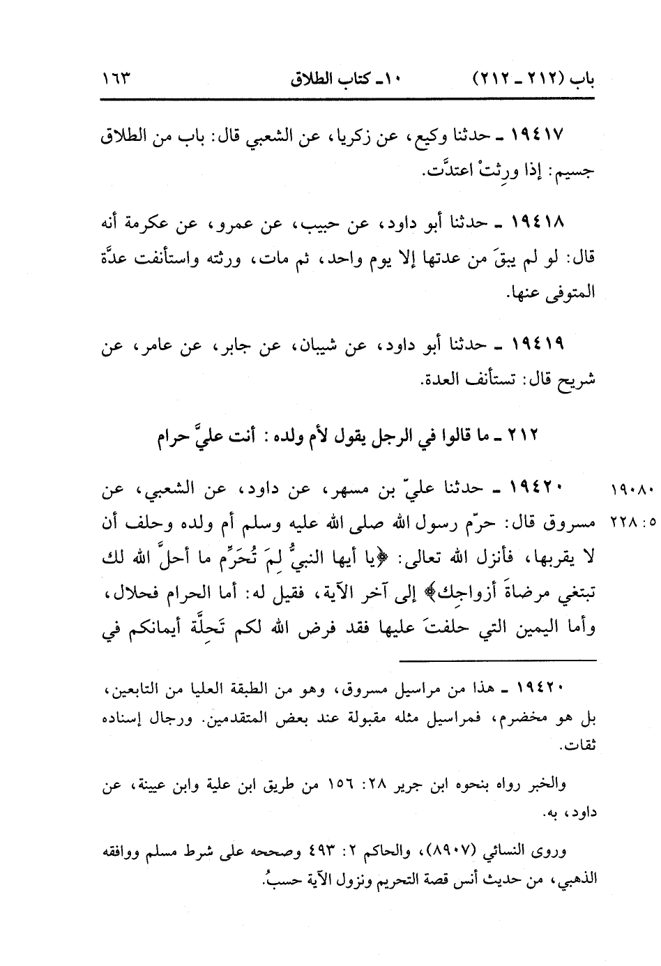 19420- حَدَّثَنَا عَلِيُّ بْنُ مُسْهِرٍ , عَنْ دَاوُدَ ، عَنِ الشَّعْبِيِّ , عَنْ مَسْرُوقٍ قَالَ : حرَّمَ رَسُولُ اللهِ صَلَّى الله عَلَيْهِ وَسَلَّمَ أُمَّ وَلَدِهِ وَحَلَفَ : أن لاَ يَقْرَبُهَا فَأَنْزَلَ اللَّهُ تَعَالَى : {يَا أَيُّهَا النَّبِيُّ لِمَ تُحَرِّمُ مَا أَحَلَّ اللَّهُ لَكَ تَبْتَغِي مَرْضَاةَ أَزْوَاجِكَ} إلَى آخِرِ الآيَةِ فَقِيلَ لَهُ : أَمَّا الْحَرَامُ فَحَلاَلٌ وَأَمَّا الْيَمِينُ الَّتِي حَلَفَت عَلَيْهَا فَقَدْ فَرَضَ اللَّهُ لكم تَحِلَّةَ أَيْمَانِكُمْ فِي الْيَمِينِ الَّتِي حَلَفَت عَلَيْهَا. (5/228).
