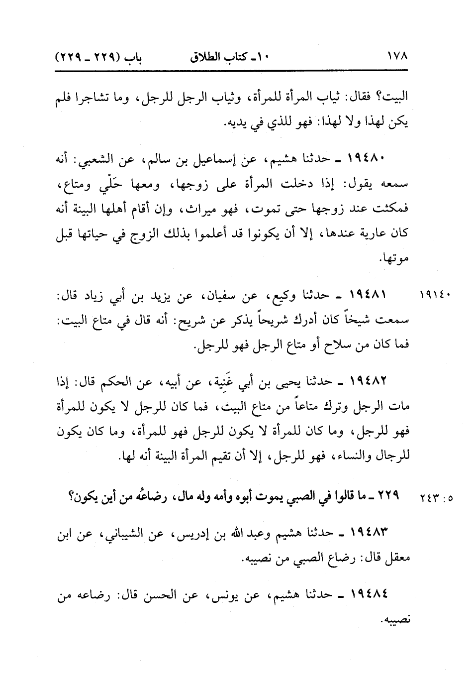 19482- حَدَّثَنَا يَحْيَى بْنُ أَبِي غَنِيةَ , عَنْ أَبِيهِ ، عَنِ الْحَكَمِ قَالَ : إذَا مَاتَ الرَّجُلُ وَتَرَكَ مَتَاعًا مِنْ مَتَاعِ الْبَيْتِ فَمَا كَانَ لِلرَّجُلِ لاَ يَكُونُ لِلْمَرْأَةِ فَهُوَ لِلرَّجُلِ وَمَا يَكُونُ لِلْمَرْأَةِ لاَ يَكُونُ لِلرَّجُلِ ، هُوَ لِلْمَرْأَةِ ، وَمَا يَكُونُ لِلرِّجَالِ وَالنِّسَاءِ فَهُوَ لِلرَّجُلِ إلاَّ أَنْ تُقِيمَ الْمَرْأَةُ الْبَيِّنَةَ أنَّهُ لَهَا. (5/242).
